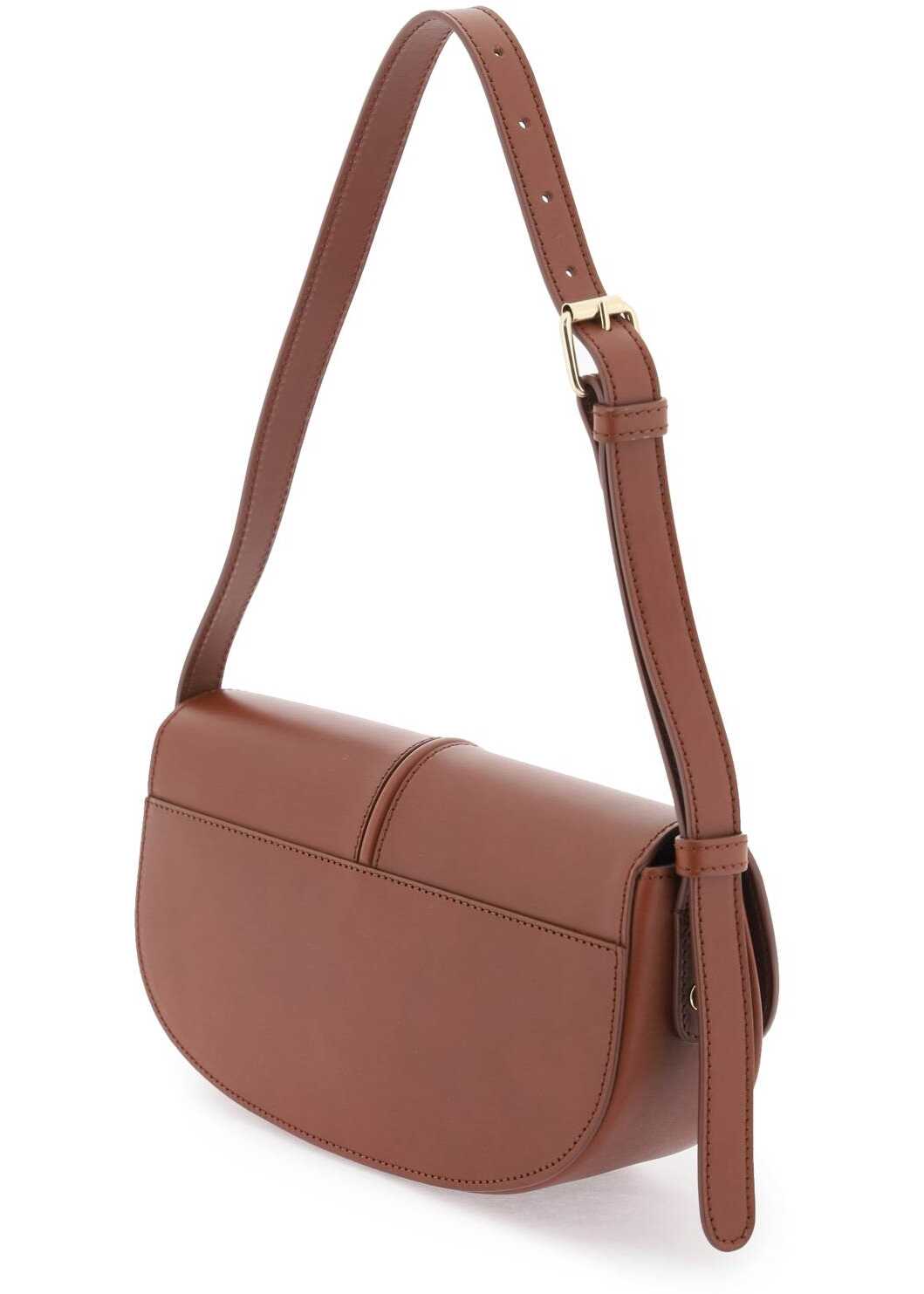 Betty shoulder bag by A.P.C. made of smooth leather with center piping on the flap. Magnetic closure, cotton-lined interior with one open pocket, adjustable leather handle. Finished with gold-tone printed lettering logo at front. Gold-finished metalware.