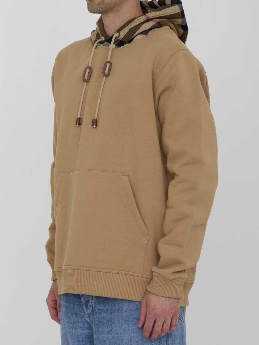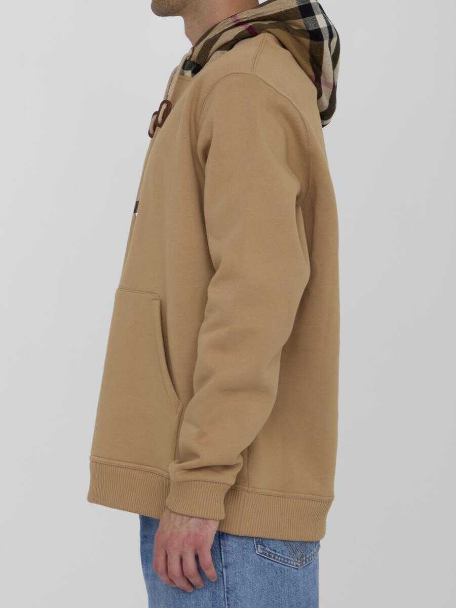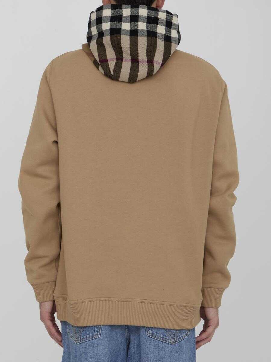 Hoodie in camel cotton blend with Check pattern on the hood. It features drawstring hood, one front kangaroo pocket and ribbed trims on cuffs and hem. Relaxed fit.
