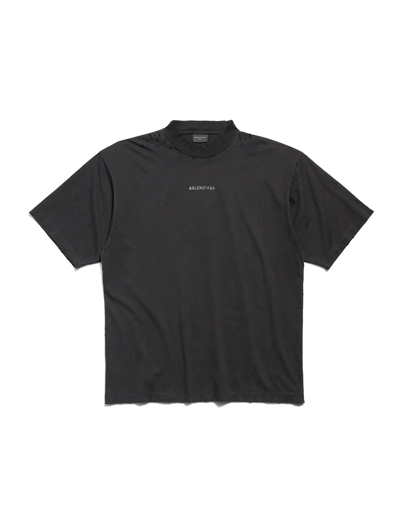 Short-sleeved crewneck t-shirt in black vintage cotton jersey with Balenciaga Back logo in rhinestones on the front and on the back. Ribbed collar. Worn-out effect. Medium fit.