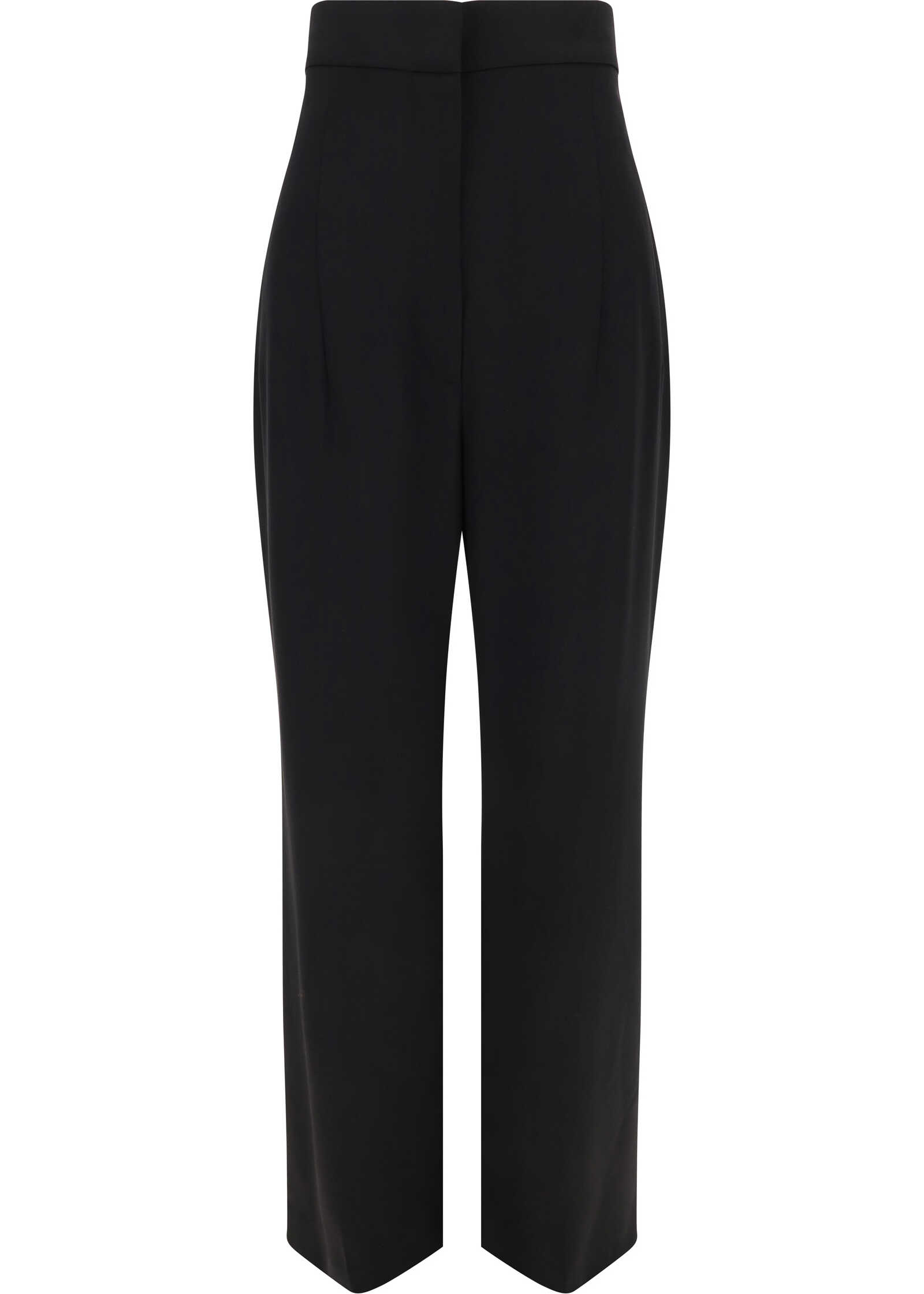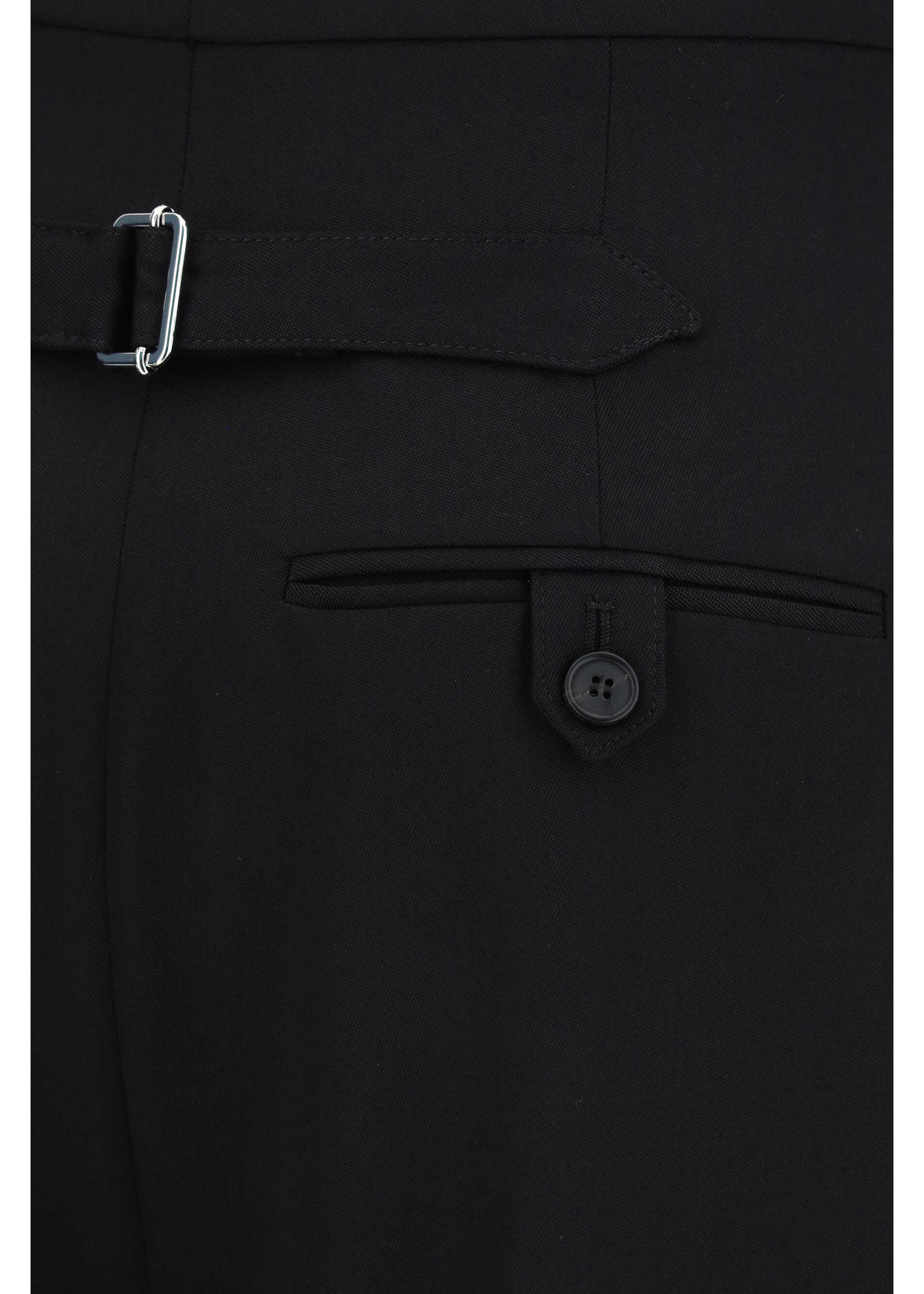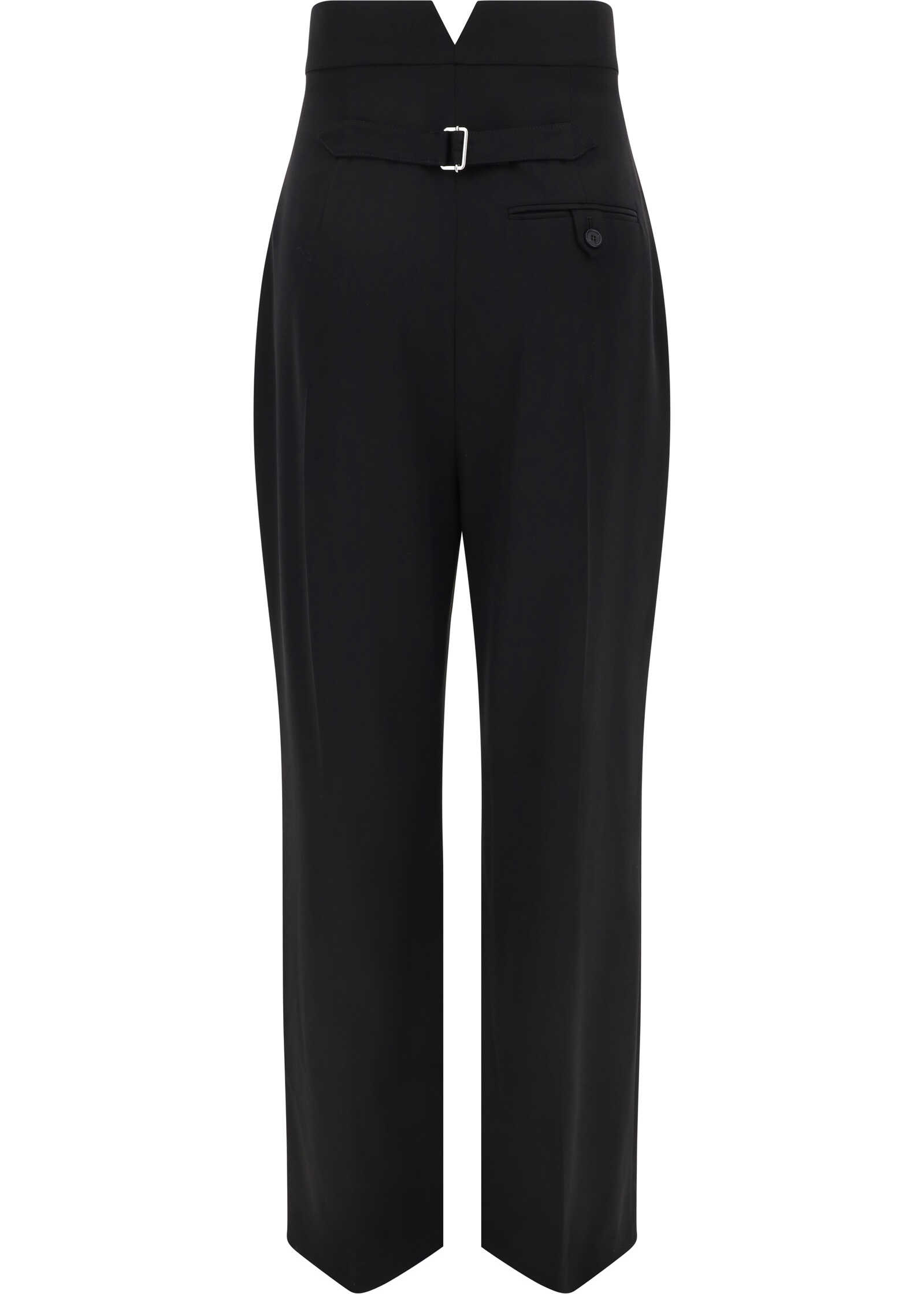 Wool Pants by Alexander McQueen, wide-leg high-waisted design, front button and zipper closure, two side slash pockets, one welt pocket on back, adjustable waistband by martingale, monochrome pattern, regular fit.