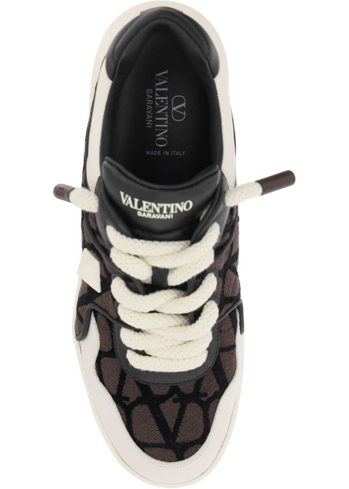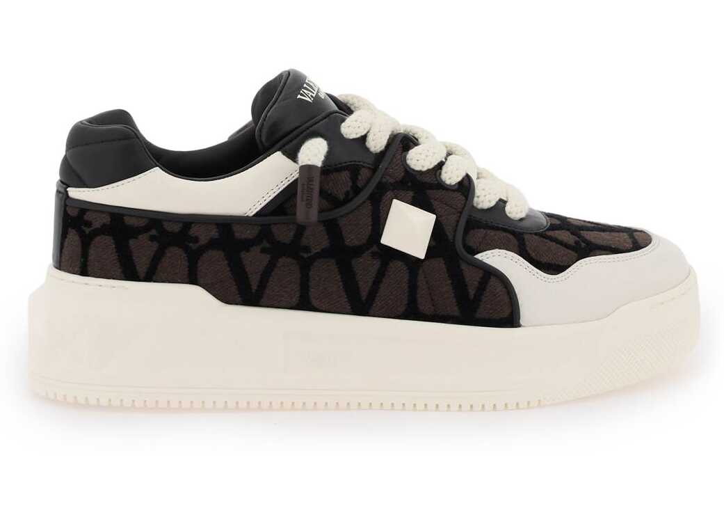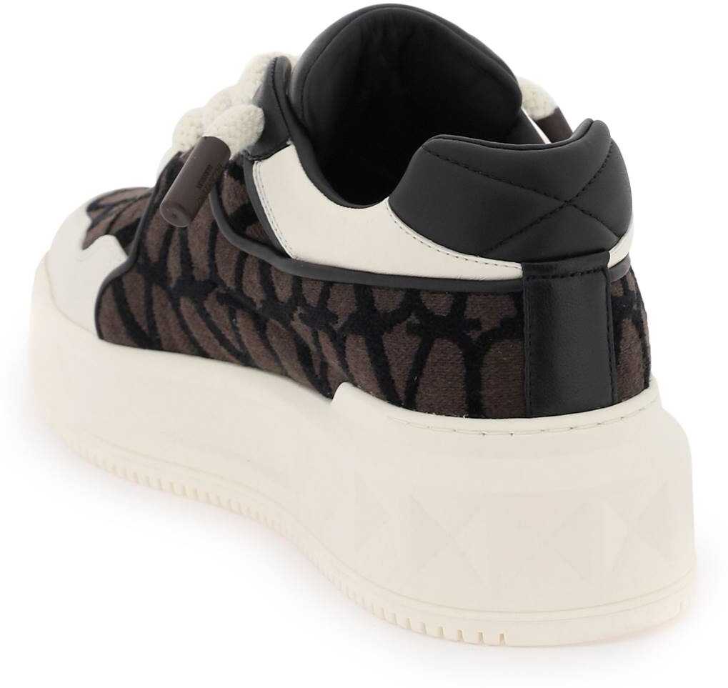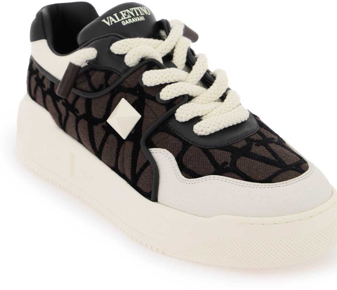 ONE STUD XL low- top sneakers by Valentino Garavani crafted in nappa leather and Toile Iconographe fabric, with maxi stud detail applied on the outer side and hammered leather insert on the toe. Padded tongue with screen-printed lettering logo, leather interior with removable insole, rubber sole with tread featuring maxi stud pattern.