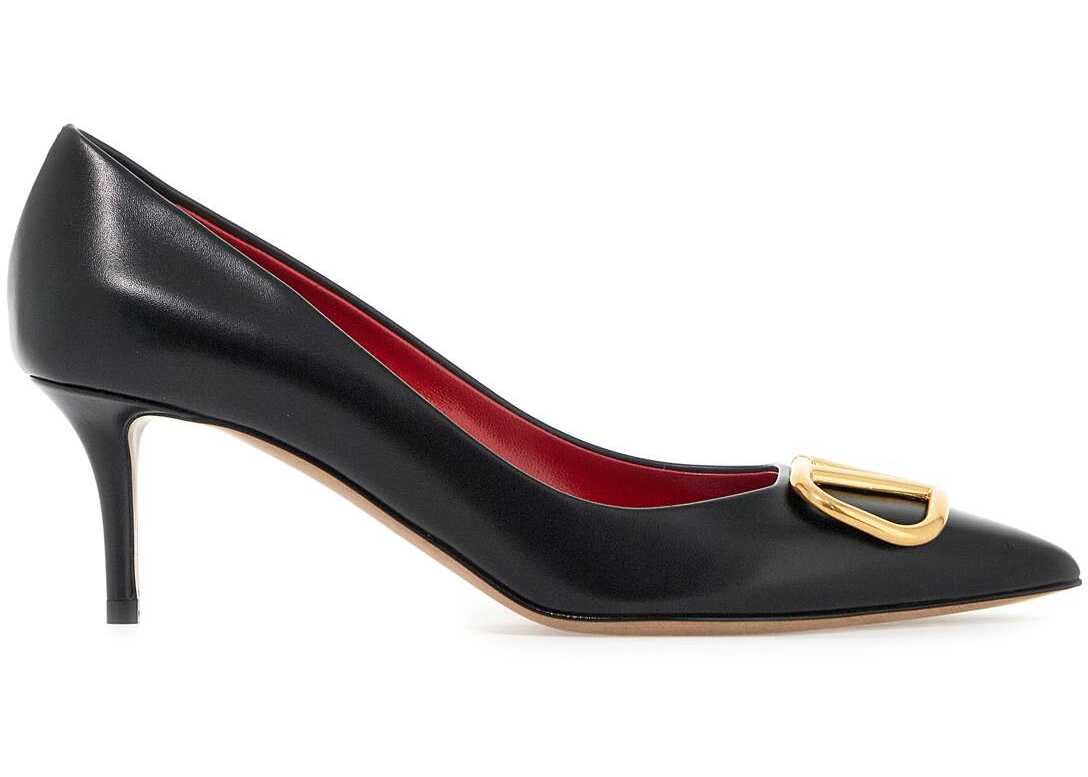 Valentino Garavani décolleté made of smooth leather with iconic VLogo Signature decoration in antiqued brass and contrasting leather interior. Covered heel and leather sole.