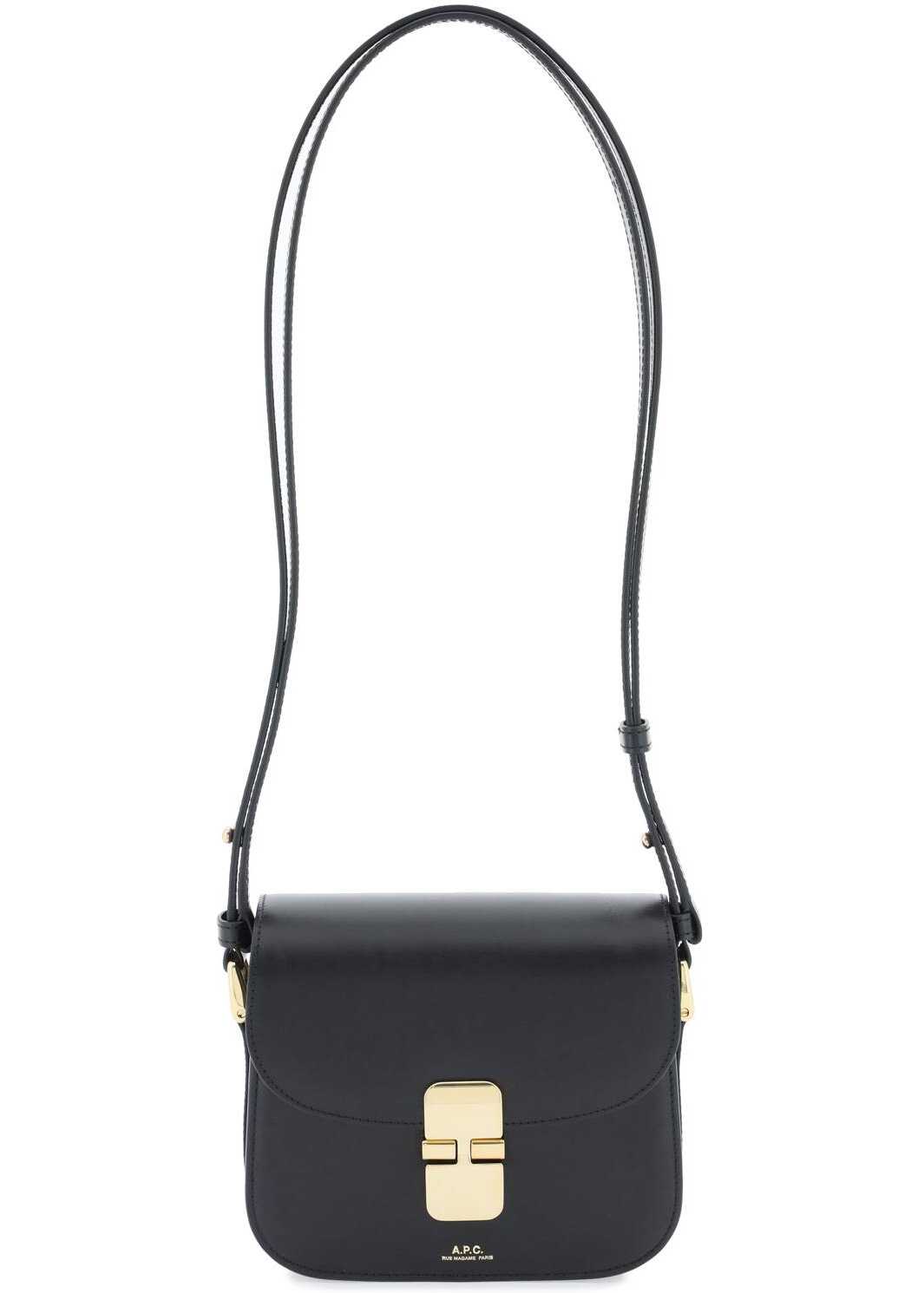 A.P.C. Grace Mini bag in smooth leather featuring flap with metal joint closure, gold-tone logo print on front and adjustable shoulder strap. Cotton lining, two flat compartments and a middle gusseted compartment. Gold-finished metalware.