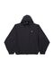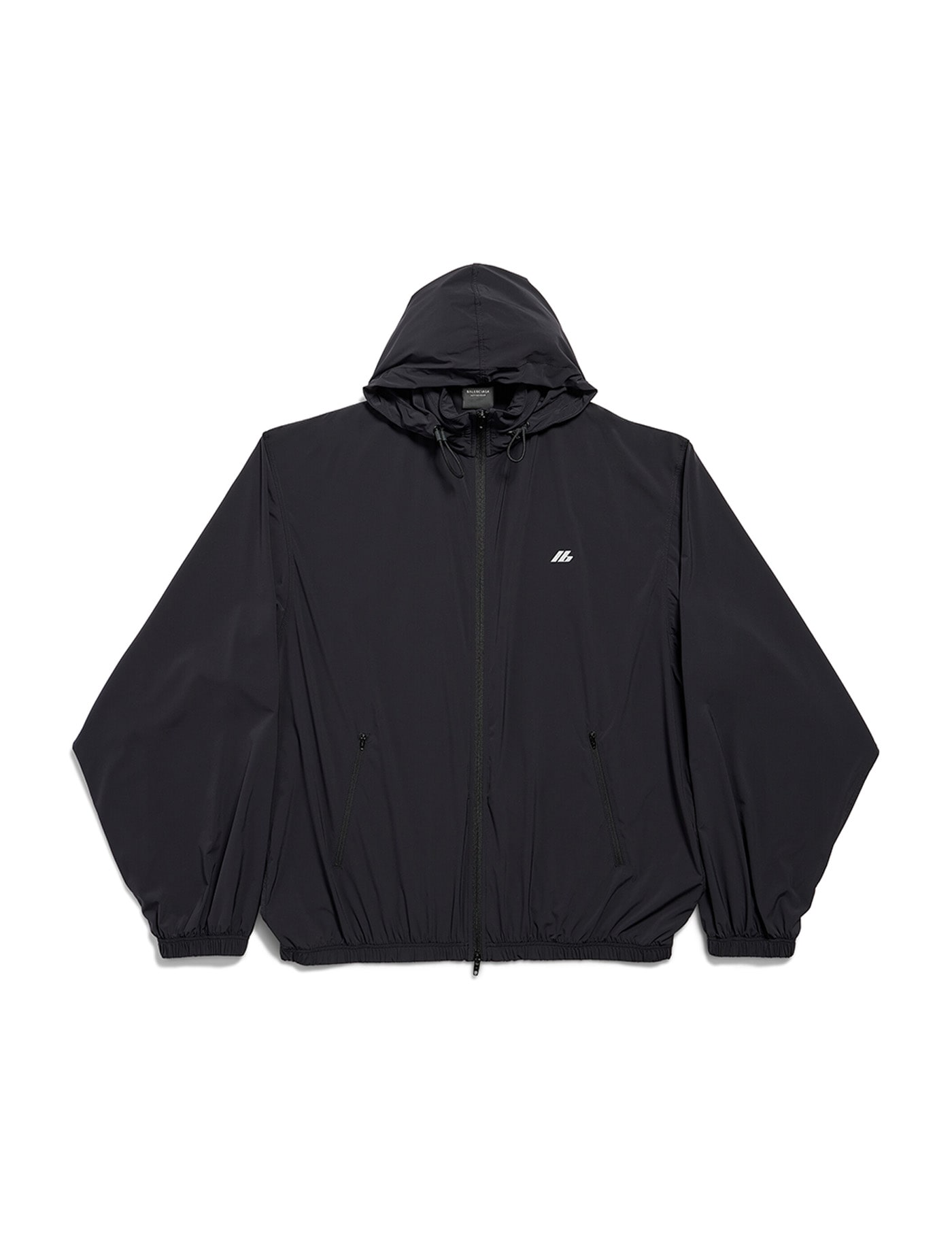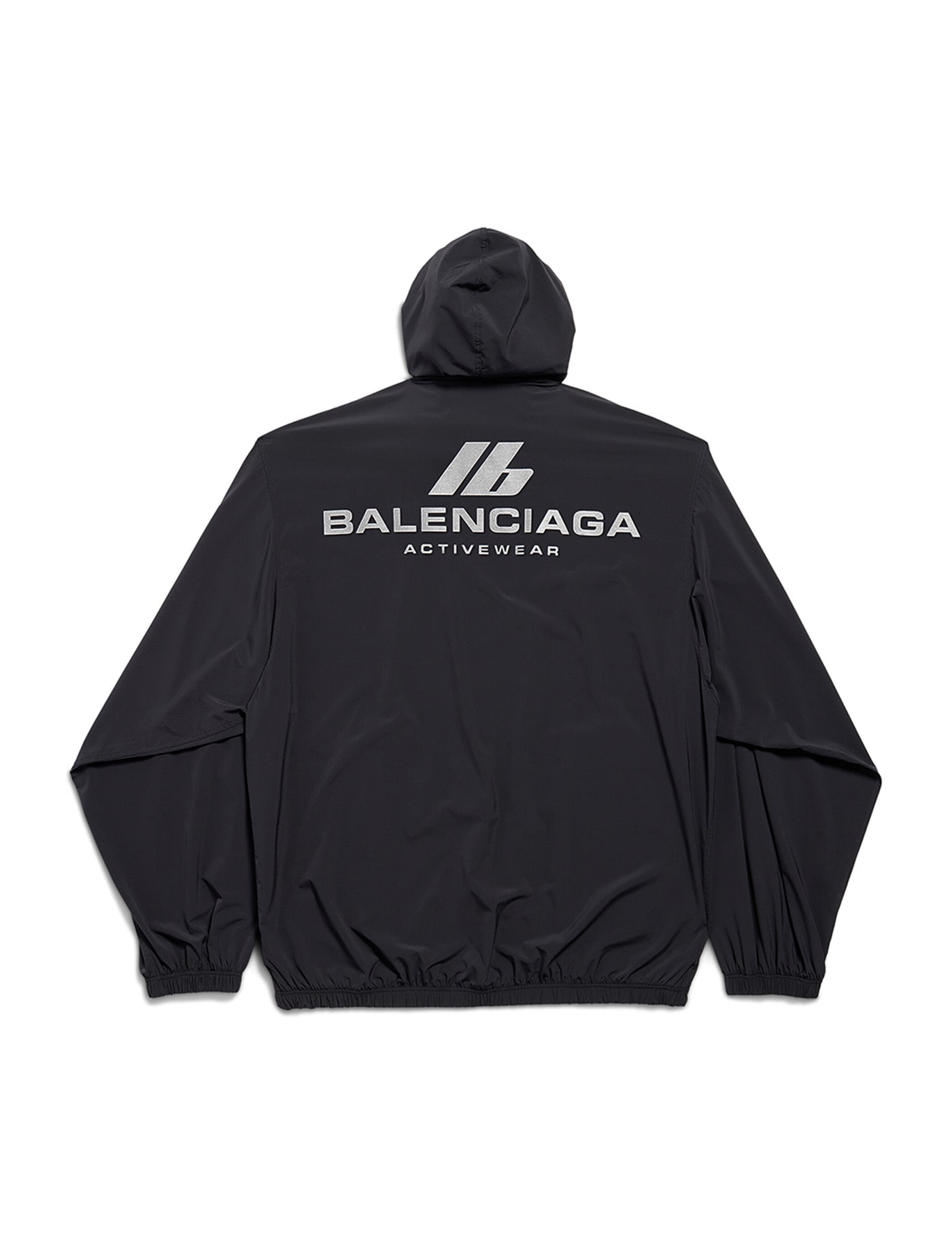 Balenciaga's windbreaker crafted in black stretch nylon with reflective logo print at chest / at back. It features high neck, extractable hood, zip closure, side pockets, long sleeves, elasticated edges and straight hem with drawstring. Unlined interior.