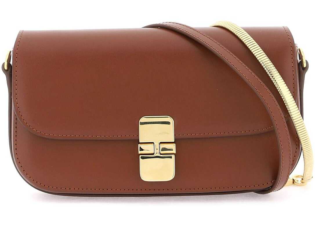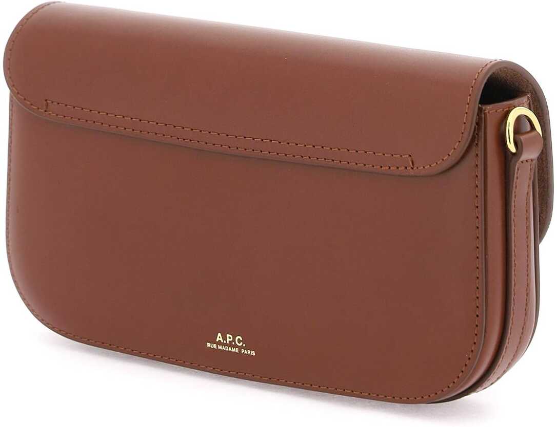 The Grace clutch by A.P.C. is made of smooth leather with a golden metal clasp and a printed gold logo on the front. The interior features a fabric lining, an open pocket, and six credit card slots. It also has a chain handle and a removable and adjustable leather shoulder strap for a versatile hand-held or crossbody look.