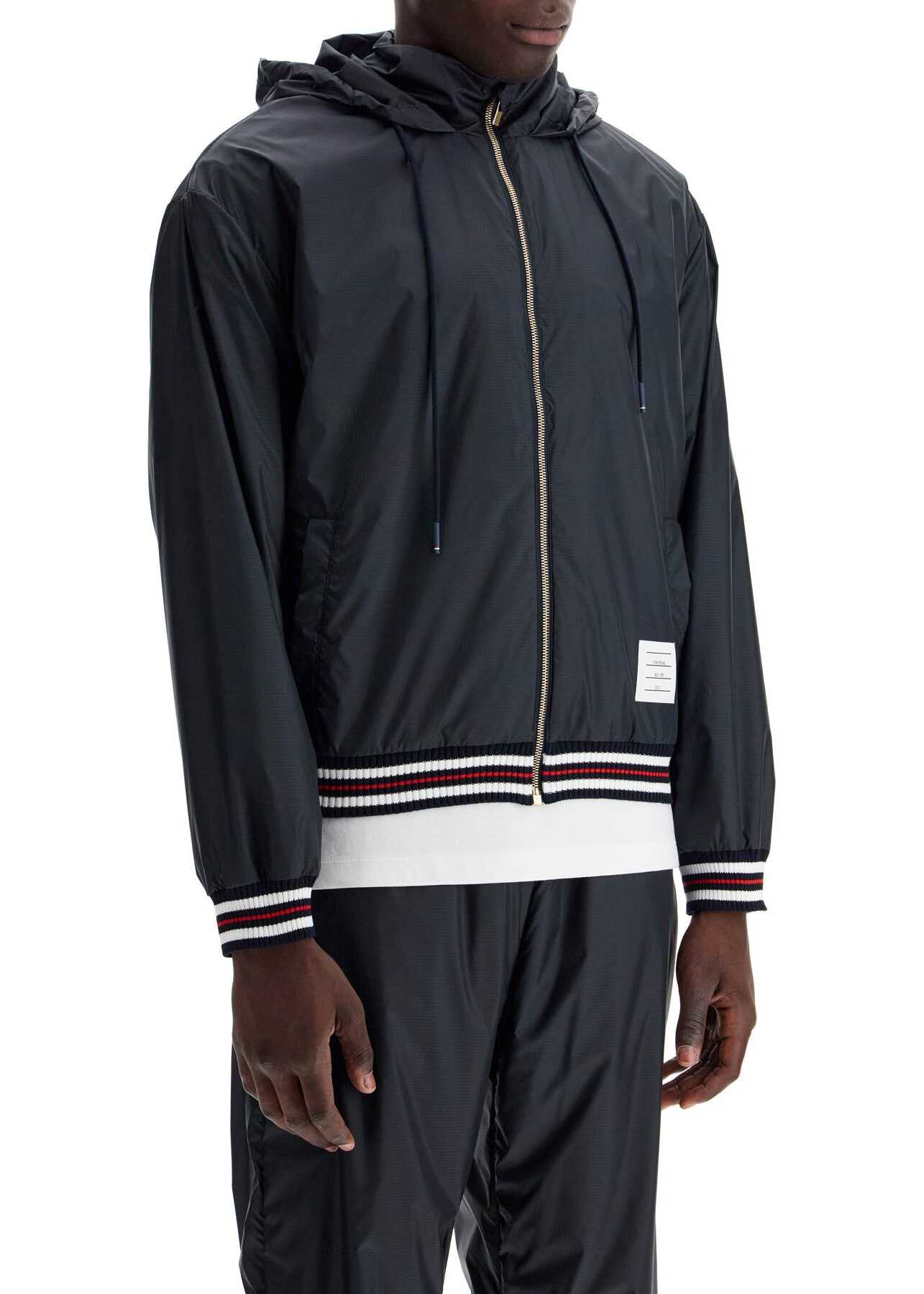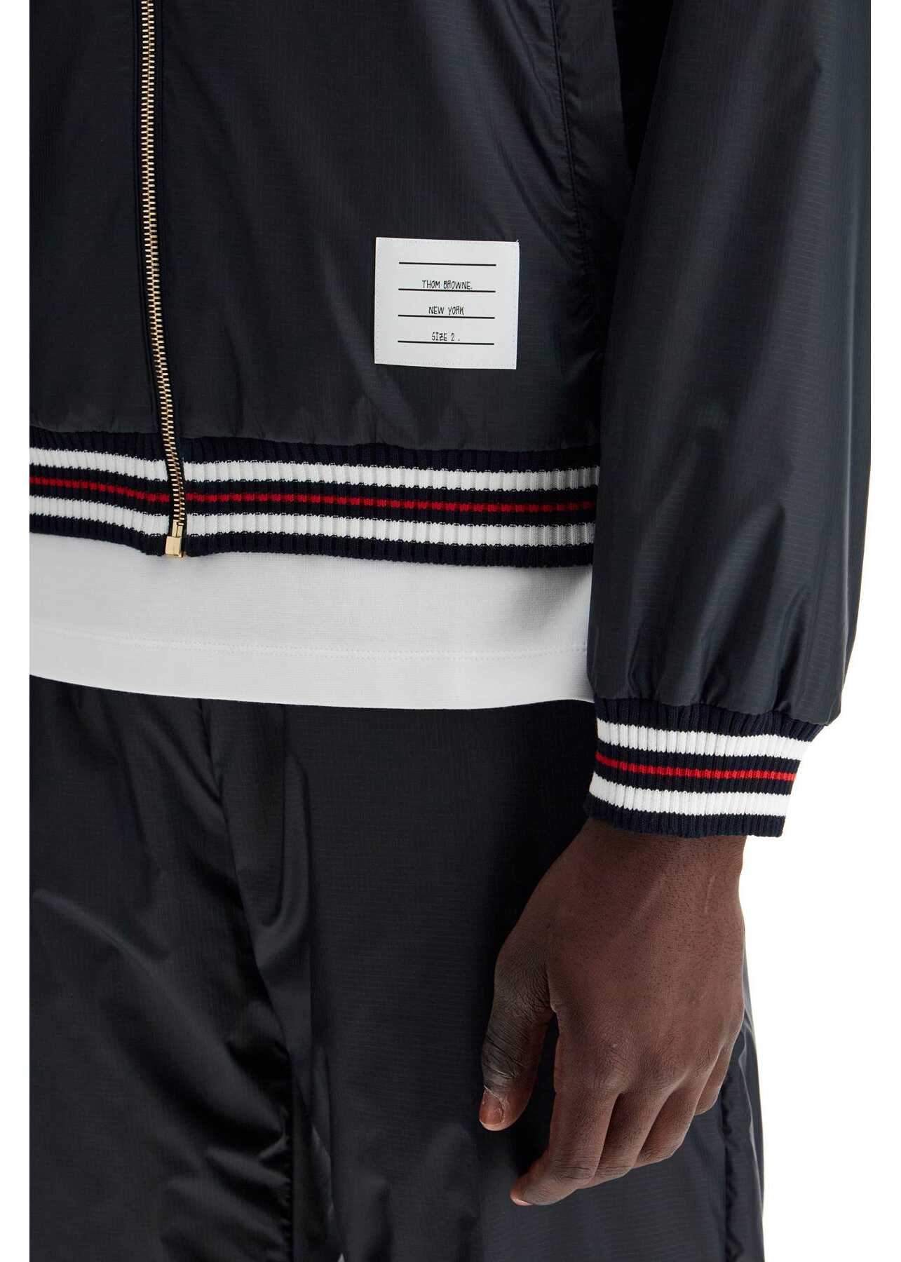 The Thom Browne windbreaker is made of ultra-resistant technical ripstop fabric with a water-repellent finish. It features ribbed knit cuffs and hem in striped ribbing, a drawstring hood, a gold metal zip closure, front flap pockets, a Name Tag on the bottom, and a classic tricolor grosgrain tab on the back of the neck. Lined in mesh, it has a short and oversized fit. The model is 187 cm tall and wears size 2