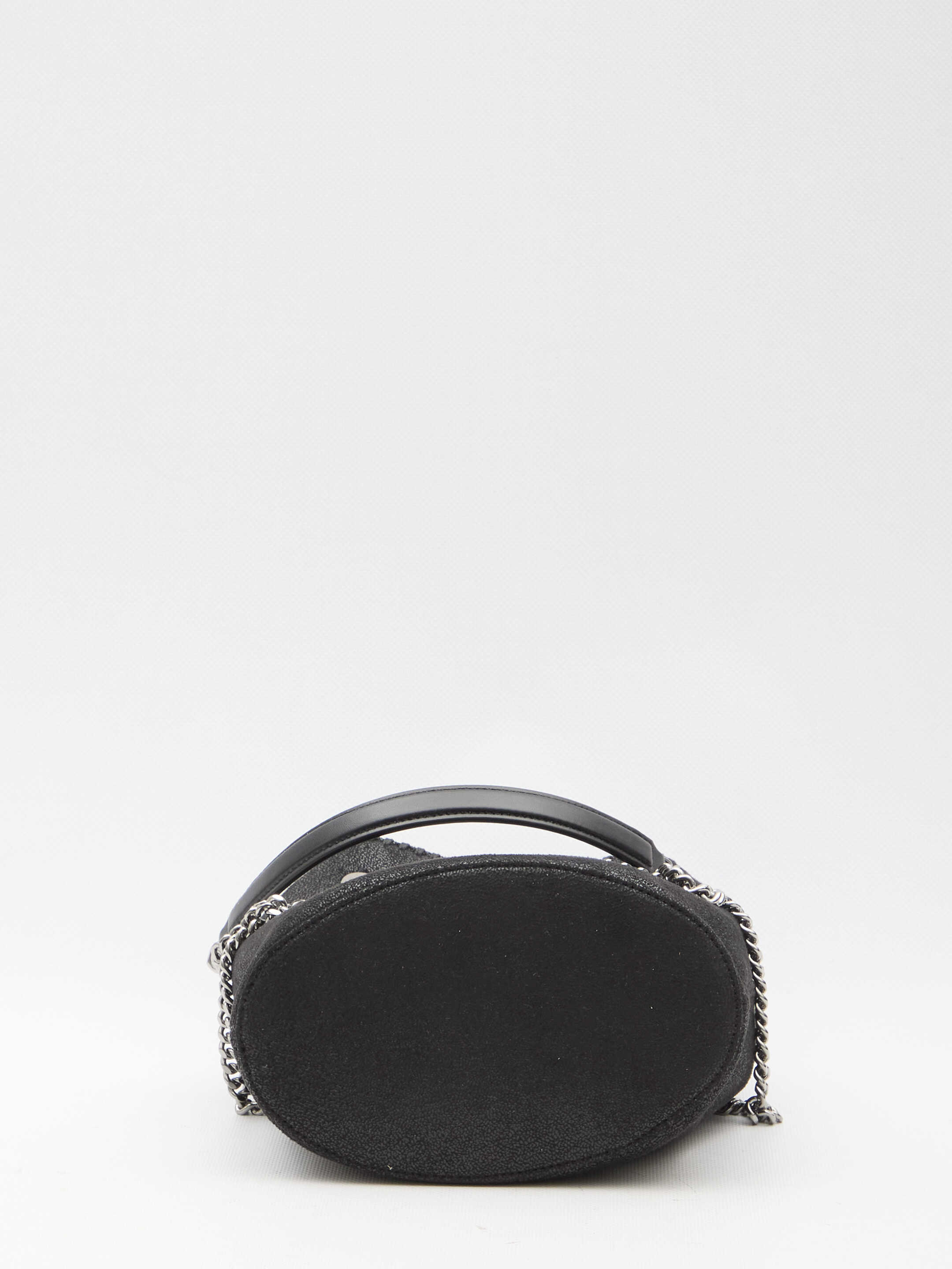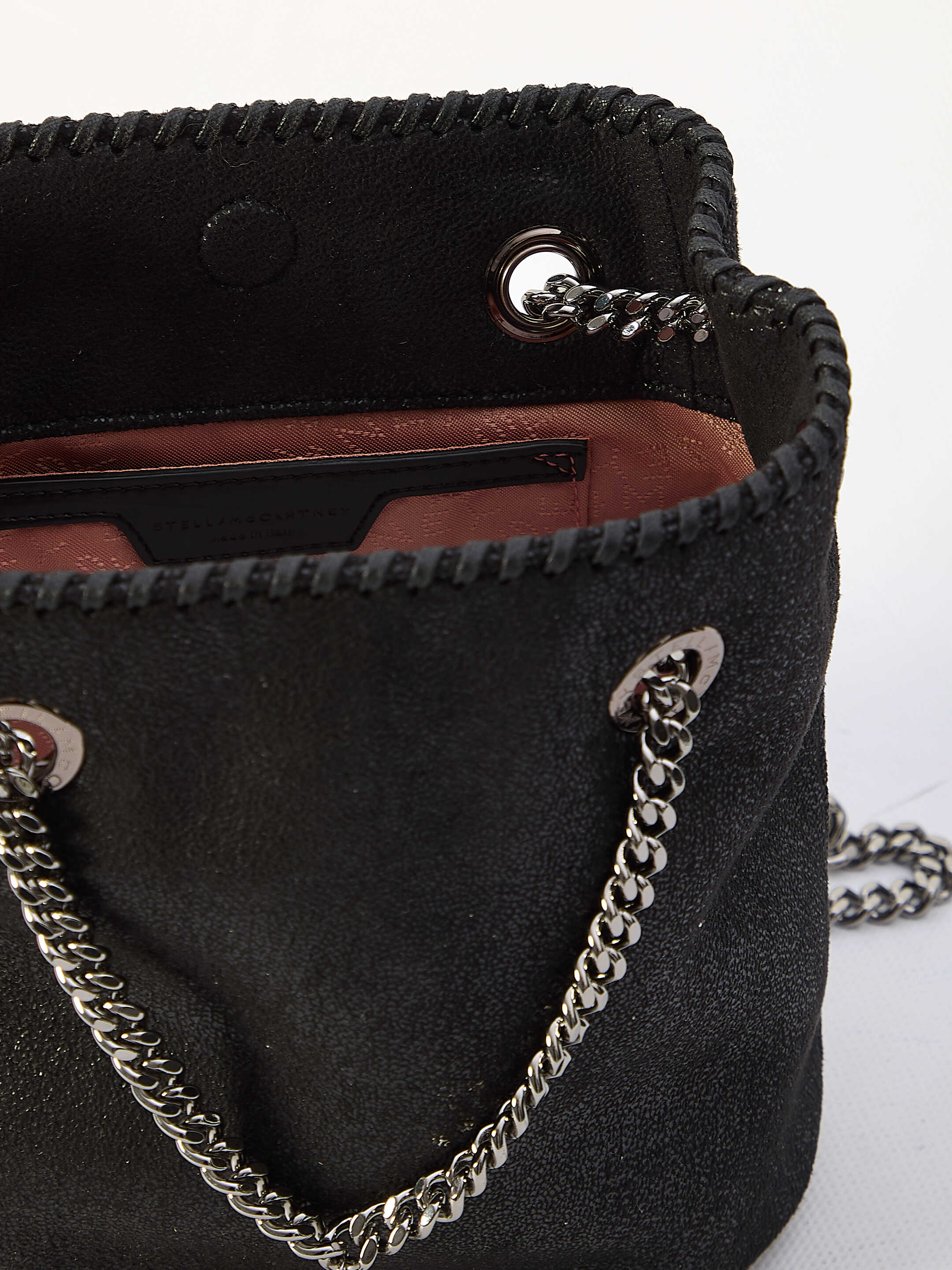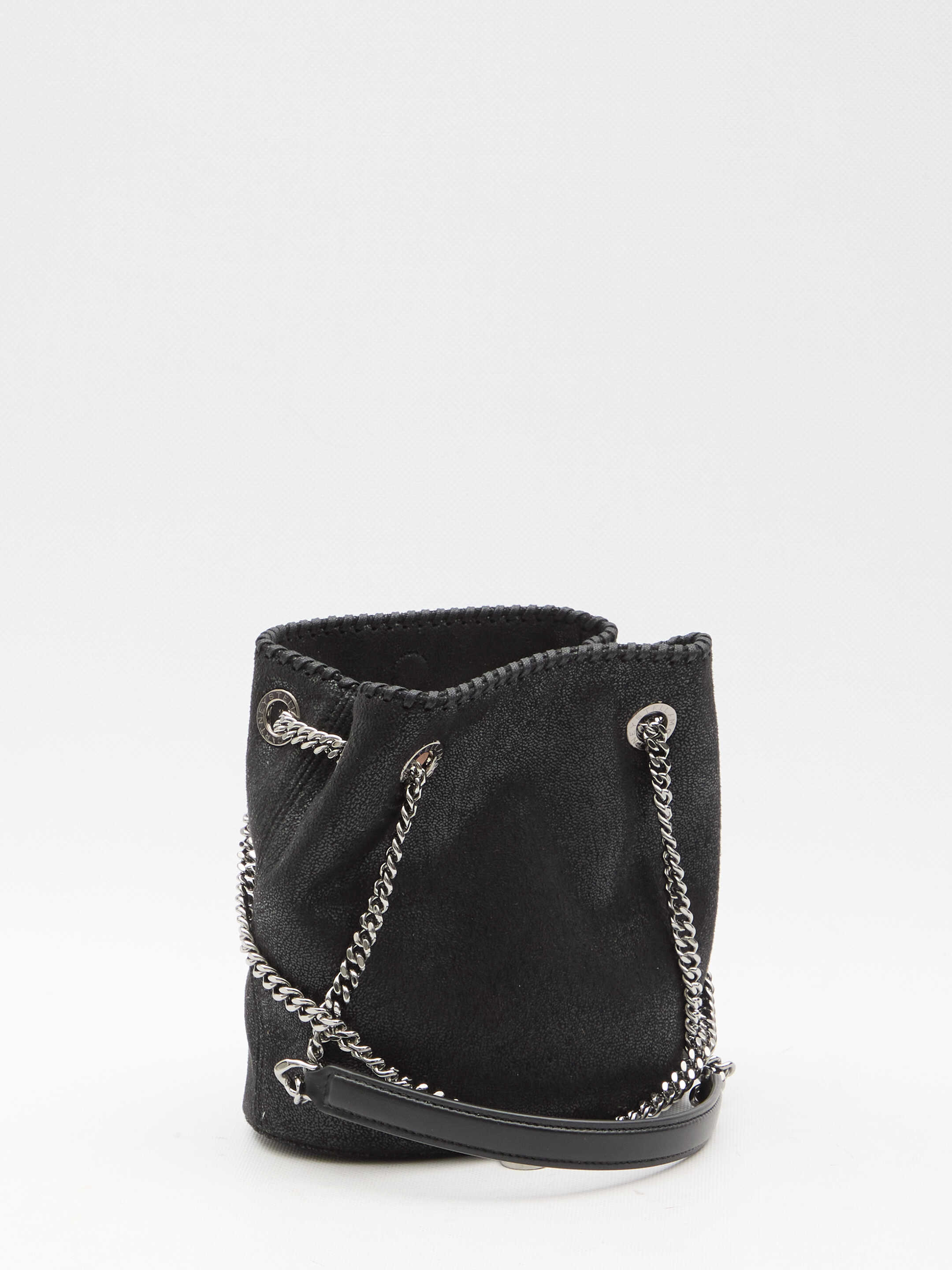 Falabella bucket bag in matte black Shaggy Deer vegan fabric with semi-shiny finish. It features silver diamond-cut chain shoulder strap with black Alter Mat detail, magnetic closure, one main interior compartment and one interior slip pocket.