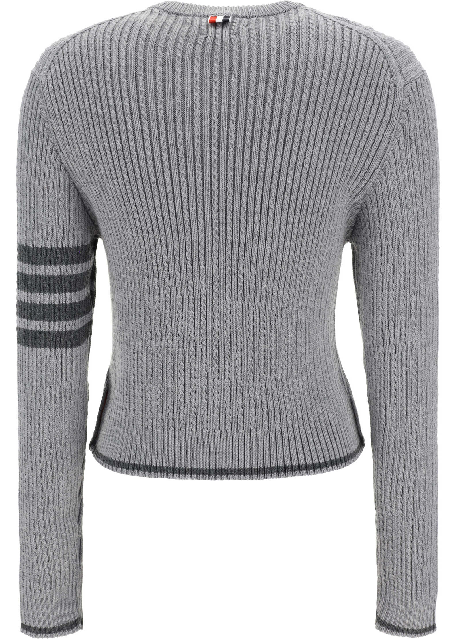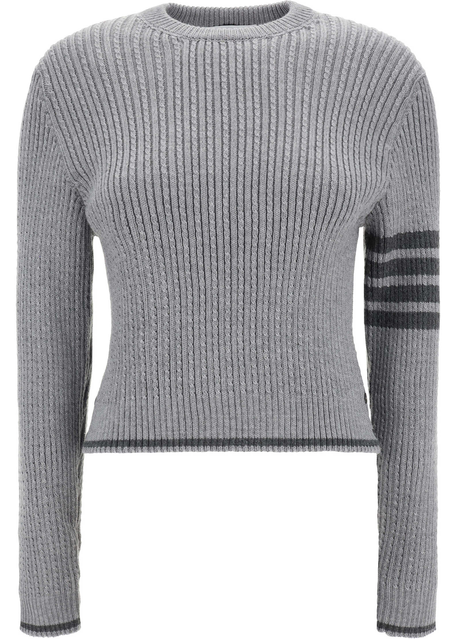 Virgin Wool Sweater by Thom Browne, cropped design, ribbed crew neck, ribbed cuffs, ribbed hem, button-adjustable side slits, brand's iconic horizontal bands on left sleeve, all-over repeated ribbed and braided knit weave, monochrome pattern, slim fit.
