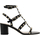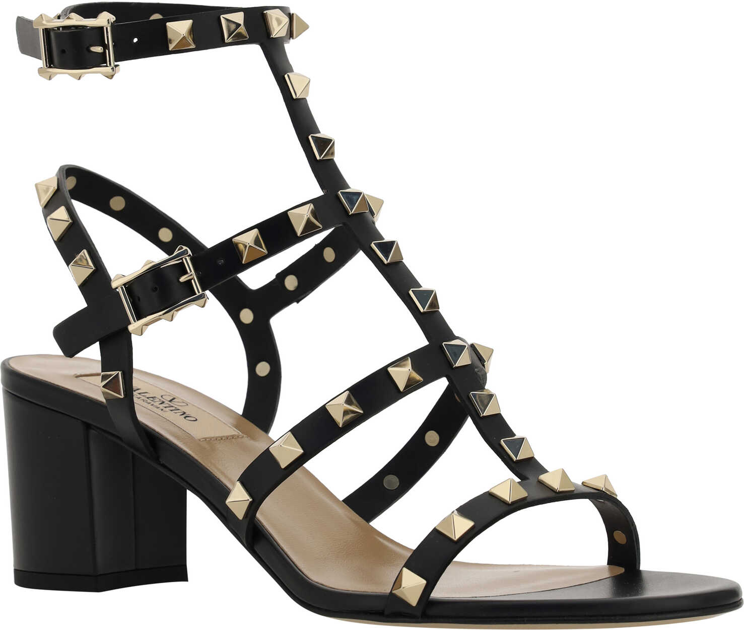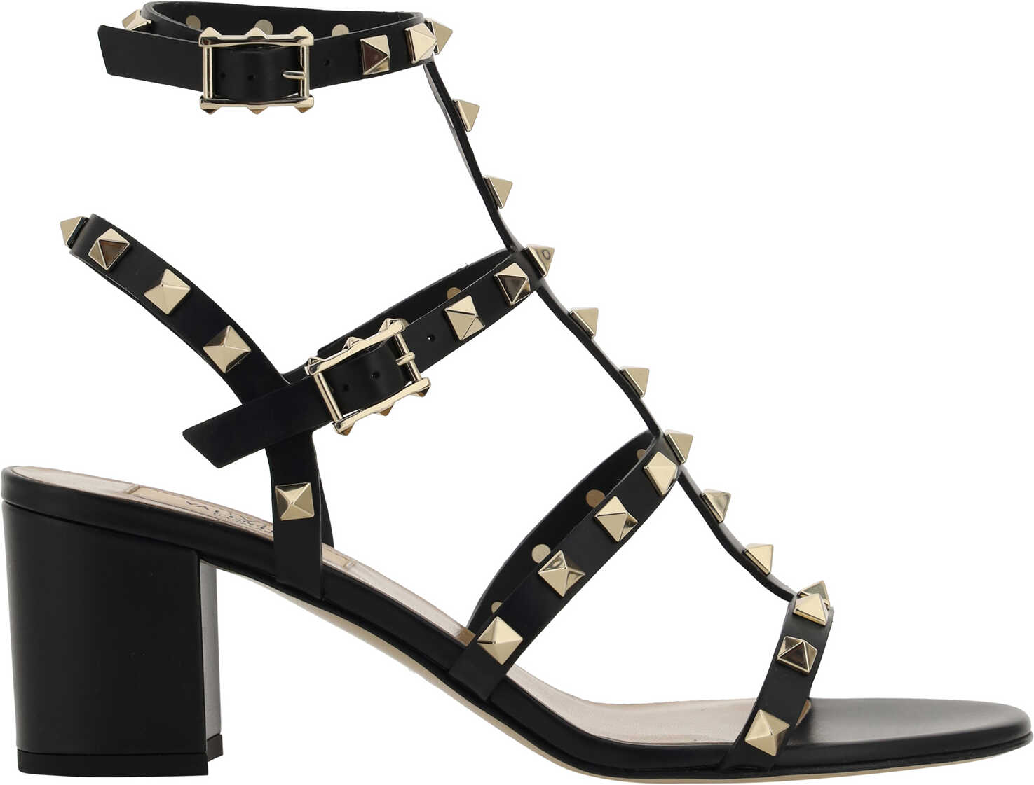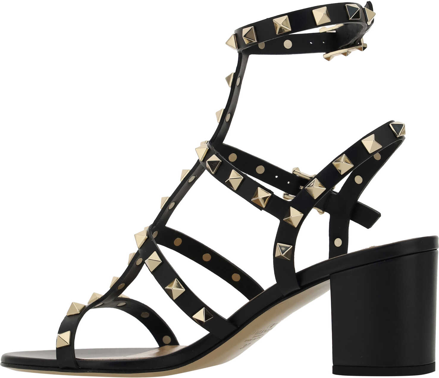 Calfskin Rockstud Sandals by Valentino Garavani, caged design with straps at front, closure by double adjustable ankle lap strap with side buckle, leather chunky heel, brand's iconic all-over applied and gold-plated Rockstud studs, logoed insole.