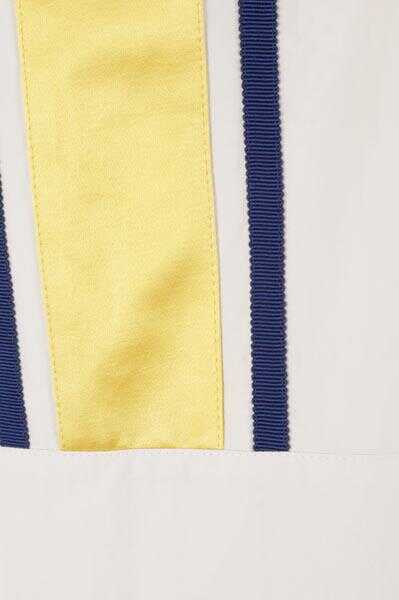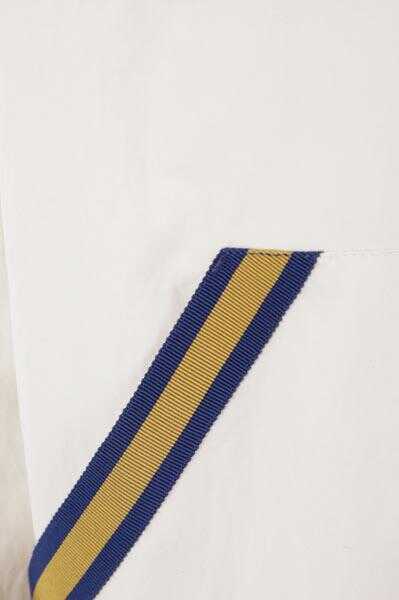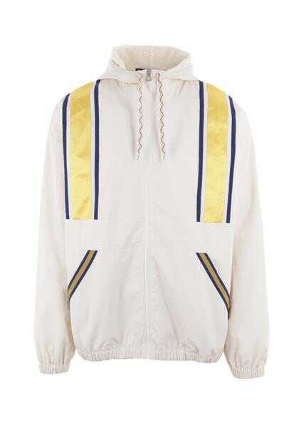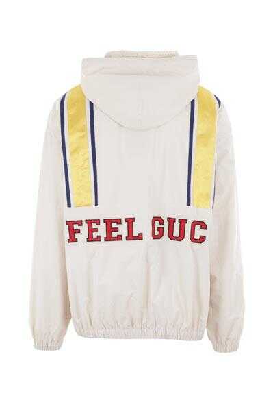 Gucci's jacket crafted in white nylon with I Feel Gucci logo patch at back and satin / grosgrain yellow and blue bands. Featuring hood with drawstring, zip closure, long sleeves, kangaroo pockets and elasticated edges. Mesh lined interior.