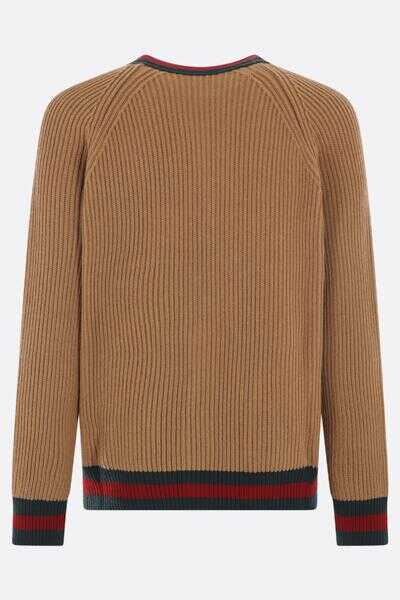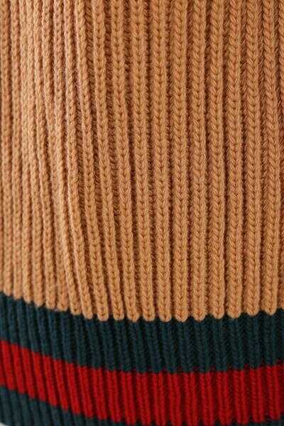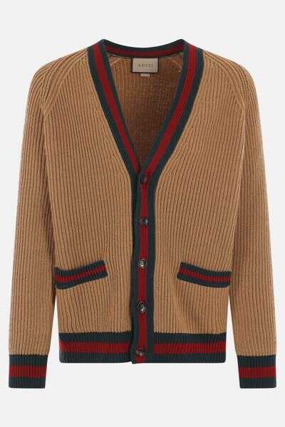 Gucci's cardigan crafted in beige wool knit with Web intarsia along trims. Featuring V-neckline, button closure, long sleeves, front pockets and ribbed edges.