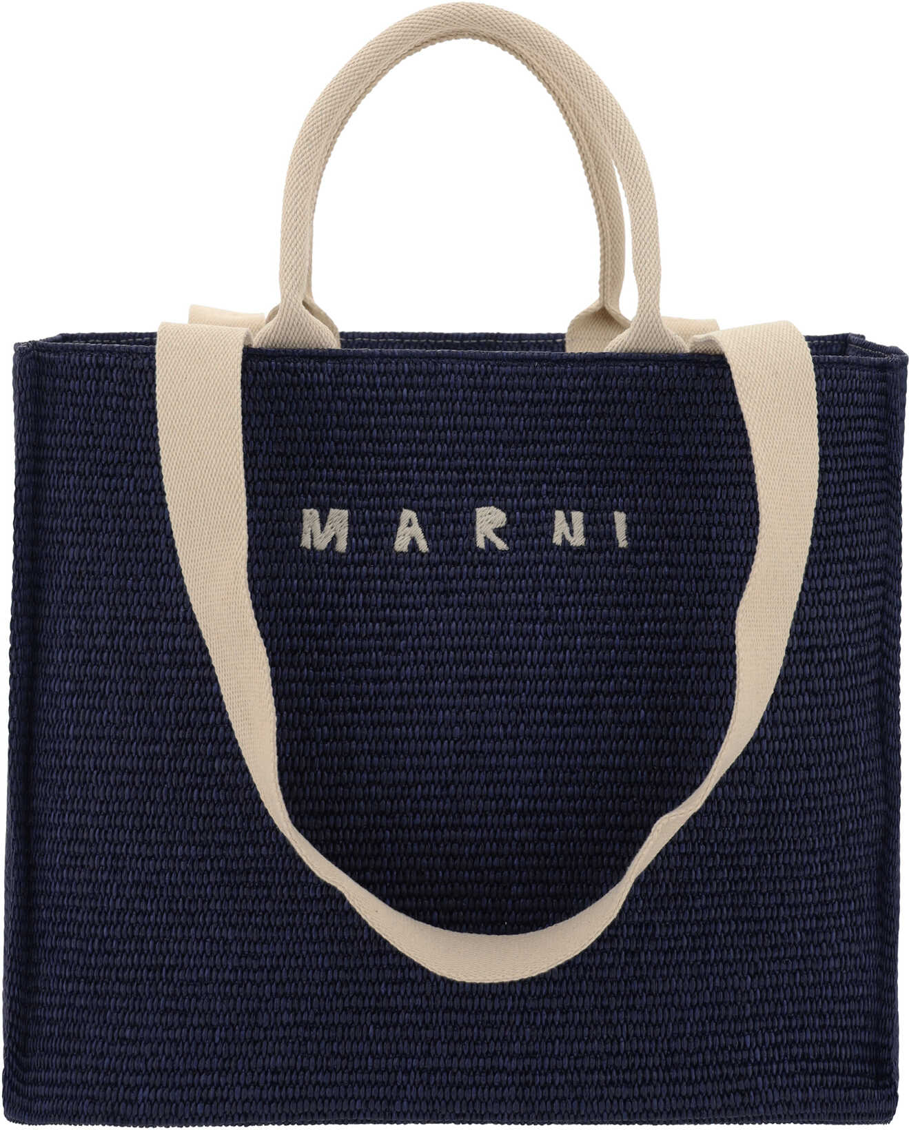 Raffia Tote Handbag by Marni, two stiff cotton handles, contrasting brand logo on front, contrasting fabric shoulder strap, inside closure, fabric lining with zippered welt pocket.