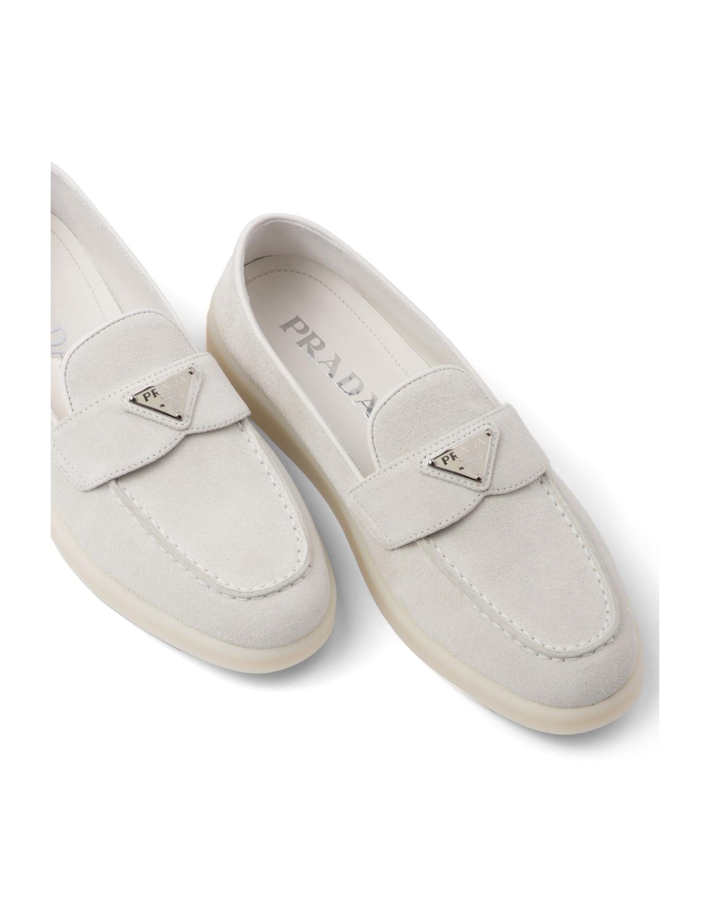 Prada's minimalist aesthetic is showcased with these loafers, crafted from smooth white suede for SS23. The pair is subtly adorned with the brand's iconic triangle logo for a recognisable look.