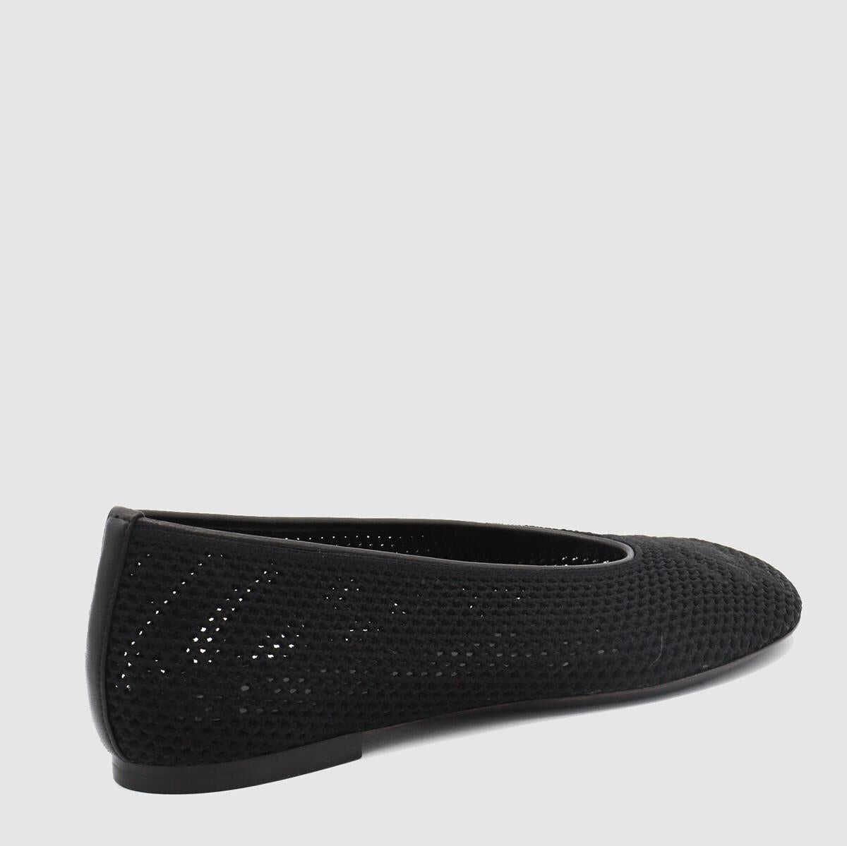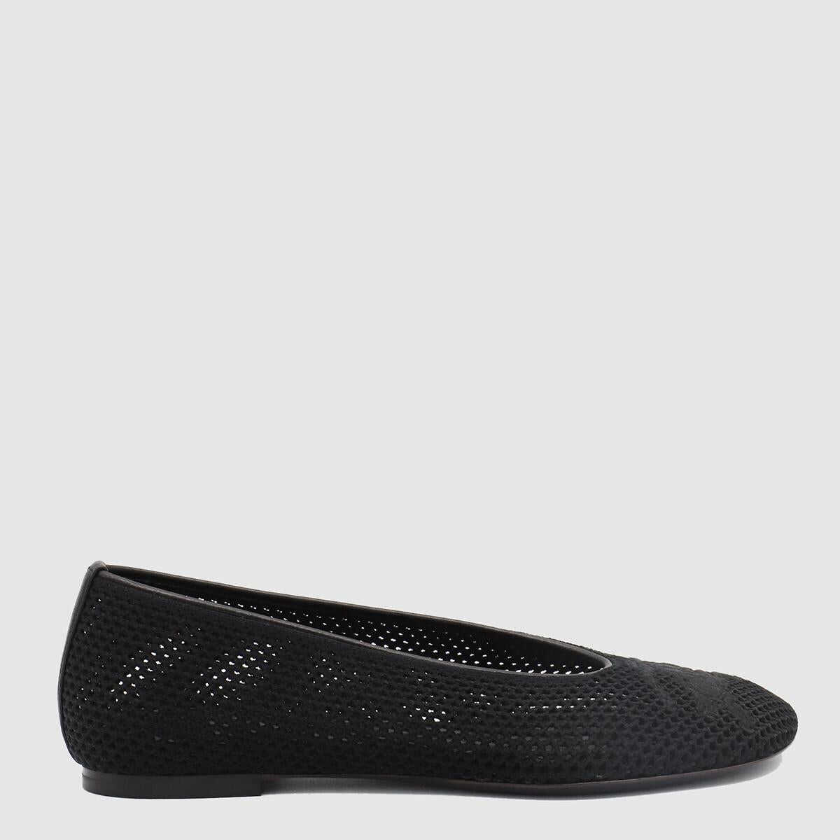 Black fltas from Burberry featuring round toe, frontal logo, all over hole and leather sole.