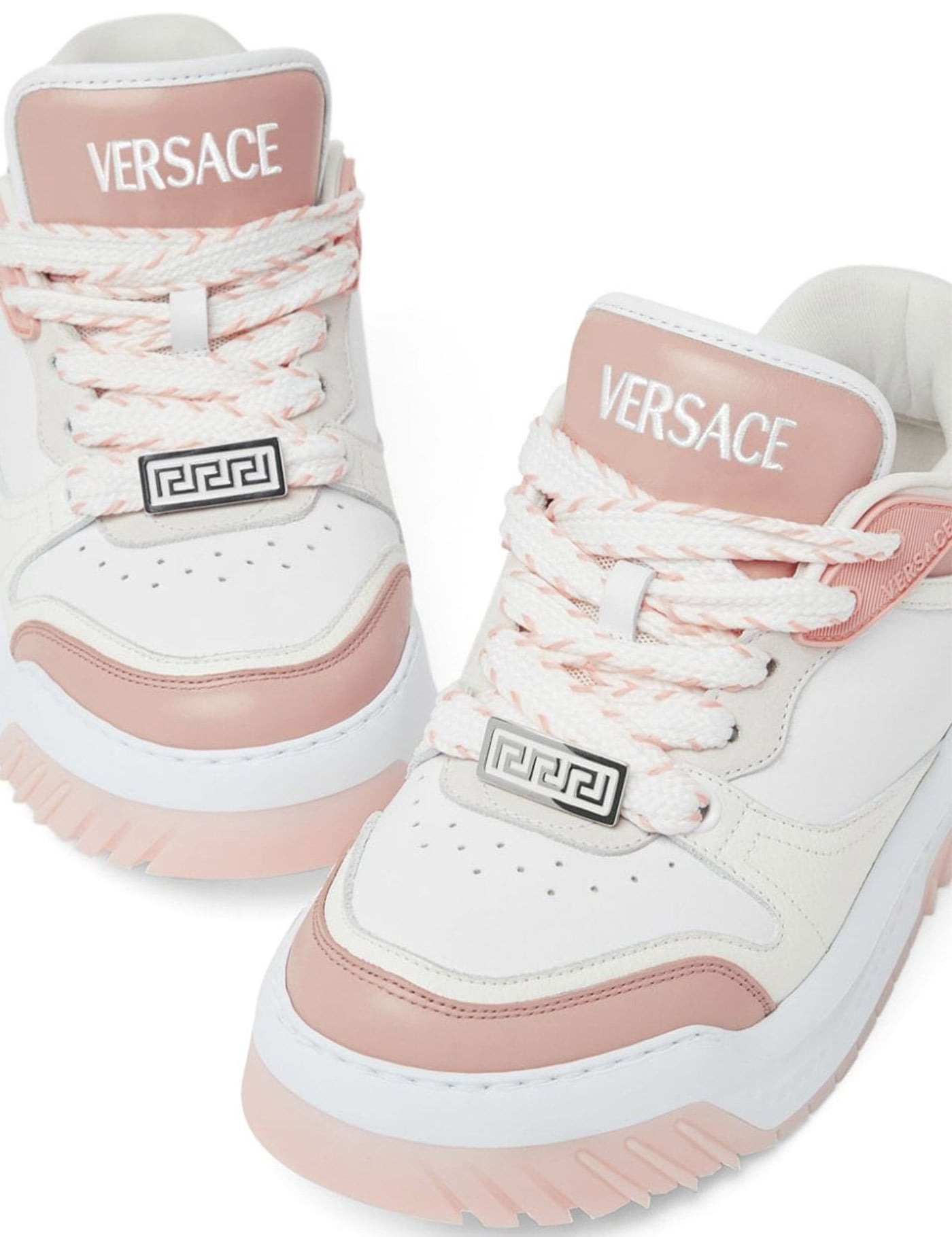 Versace's Odissea sneakers are made of smooth leather with contrasting inserts and hammered leather. The design is embellished by a Greek enamel metal plaque on the flat laces, and features an embroidered logo on the tongue and laminated on the nubuck spoiler. Perforated toe, fabric interior with removable insole, and two-tone rubber sole complete the look.