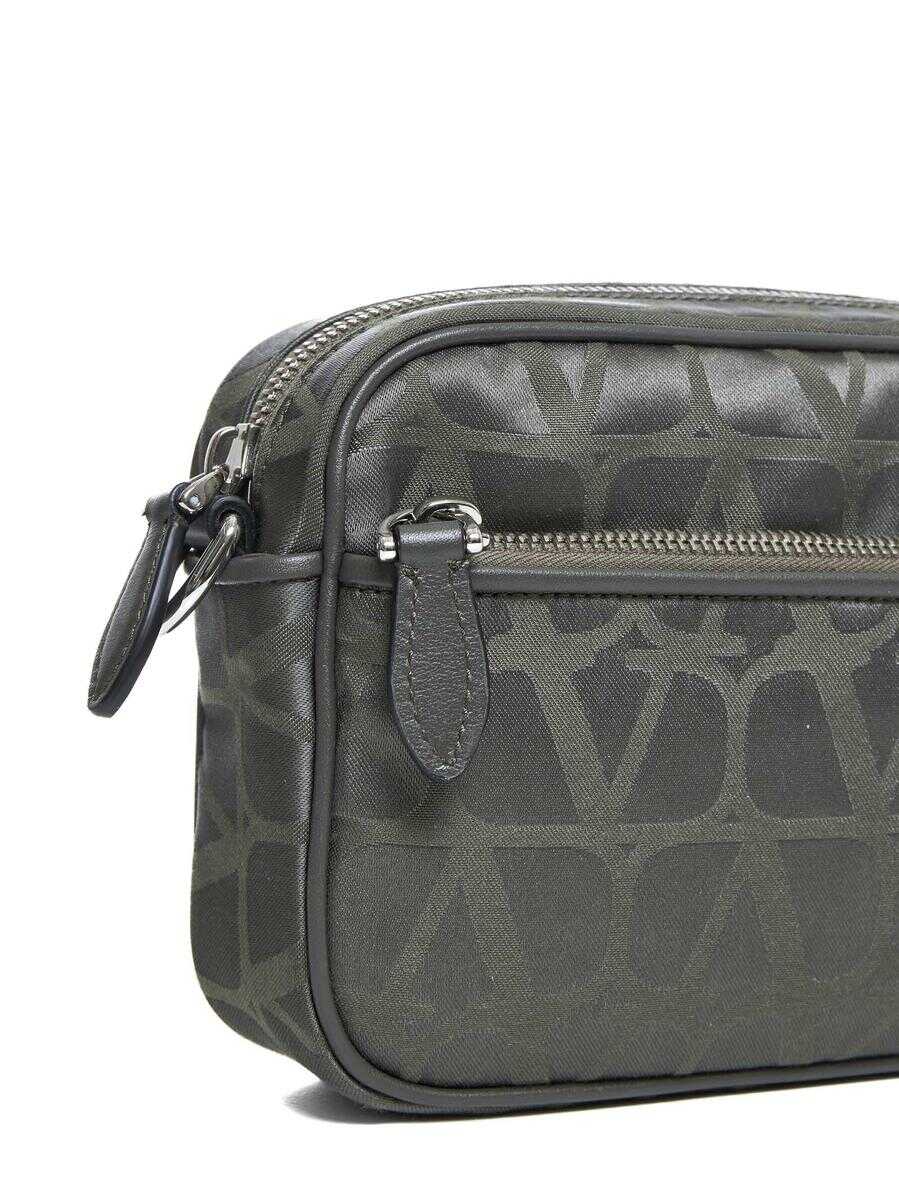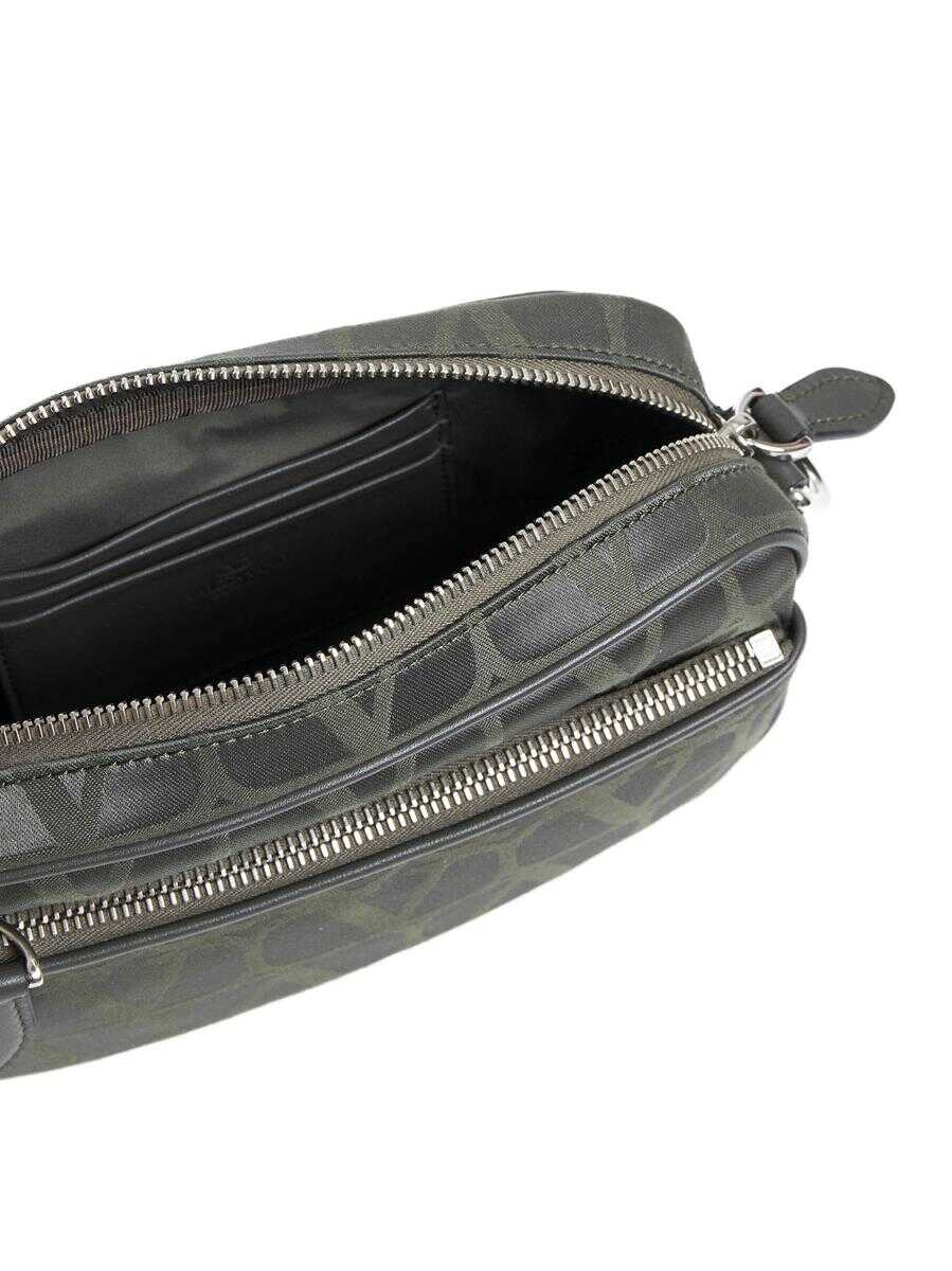 Valentino Garavani’s Toile Iconographe cotton blend fabric crossbody bag in shades of military green featuring an adjustable and detachable fabric shoulder strap, main compartment and front pocket closed by zip, leather edges and details, internal card slots and silver-tone metal hardware.