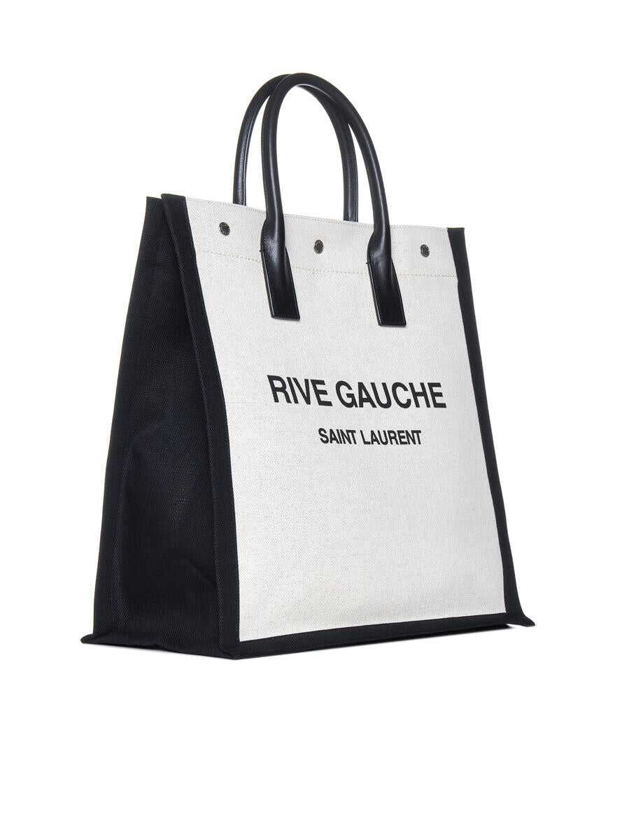 Saint Laurent’s Rive Gauche tote bag in ecru and black cotton and linen canvas featuring two black leather top handles, lettering logo printed in black at one side, snap buttons, inner zip pocket silver-tone metal hardware.
