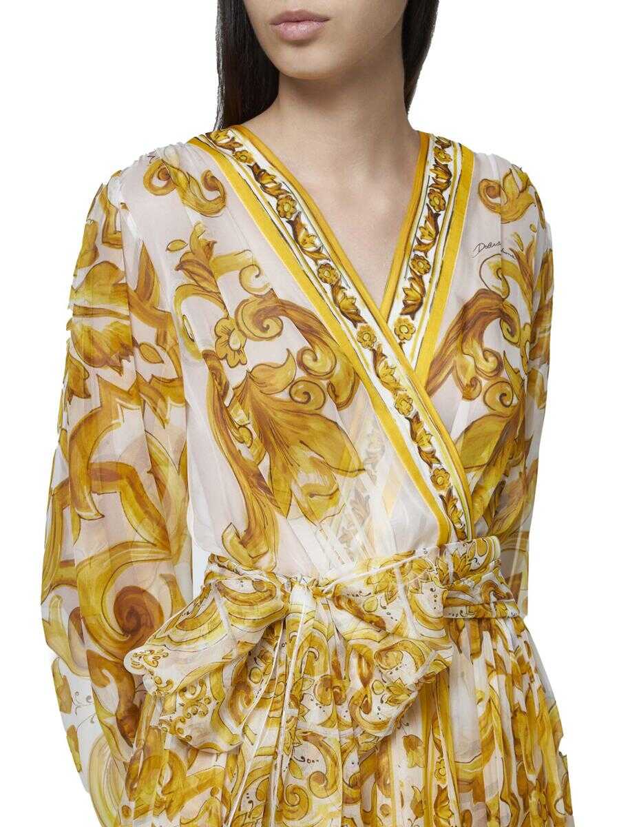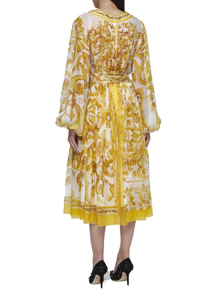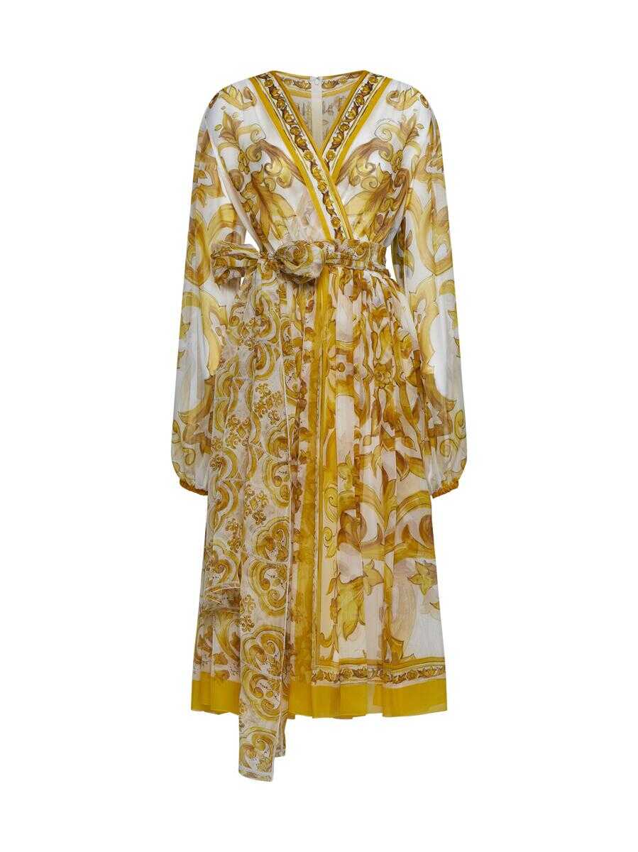 Dolce & Gabbana's Majolica print silk chiffon midi dress in shades of yellow on a white background featuring a wrap V-neck, matching self-tie waist belt, long blouson sleeves with elasticated cuffs, flared pleated skirt and zip fastening at center back.
