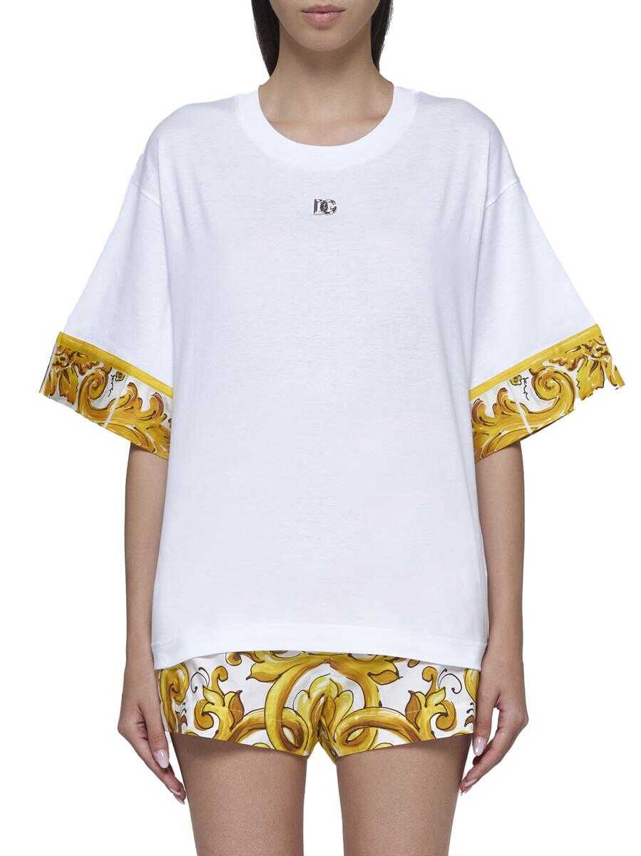 Dolce & Gabbana’s white cotton and silk blend oversized and boxy-fit t-shirt featuring a crew neck, silver-tone metal DG logo plaque on the chest, dropped shoulders and edge along the half sleeves with Majolica print in shades of yellow.