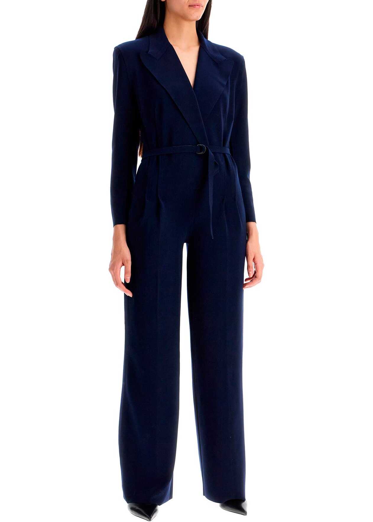 Made of comfortable poly lycra with laser-cut trims, this Norma Kamali jumpsuit boasts a surplice top that replicates a double-breasted jacket with peaked lapels, padded shoulders and an internal hook-and-loop closure. The waist is defined by front pleats and a matching D-ring belt, then falls into a pair of fluid, straight pants with side pockets. The model is 177 cm tall and wears a size XS.