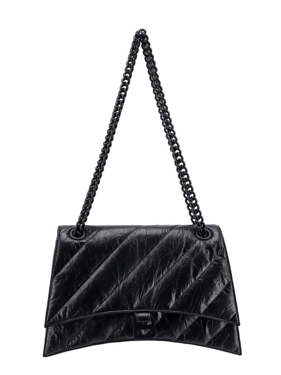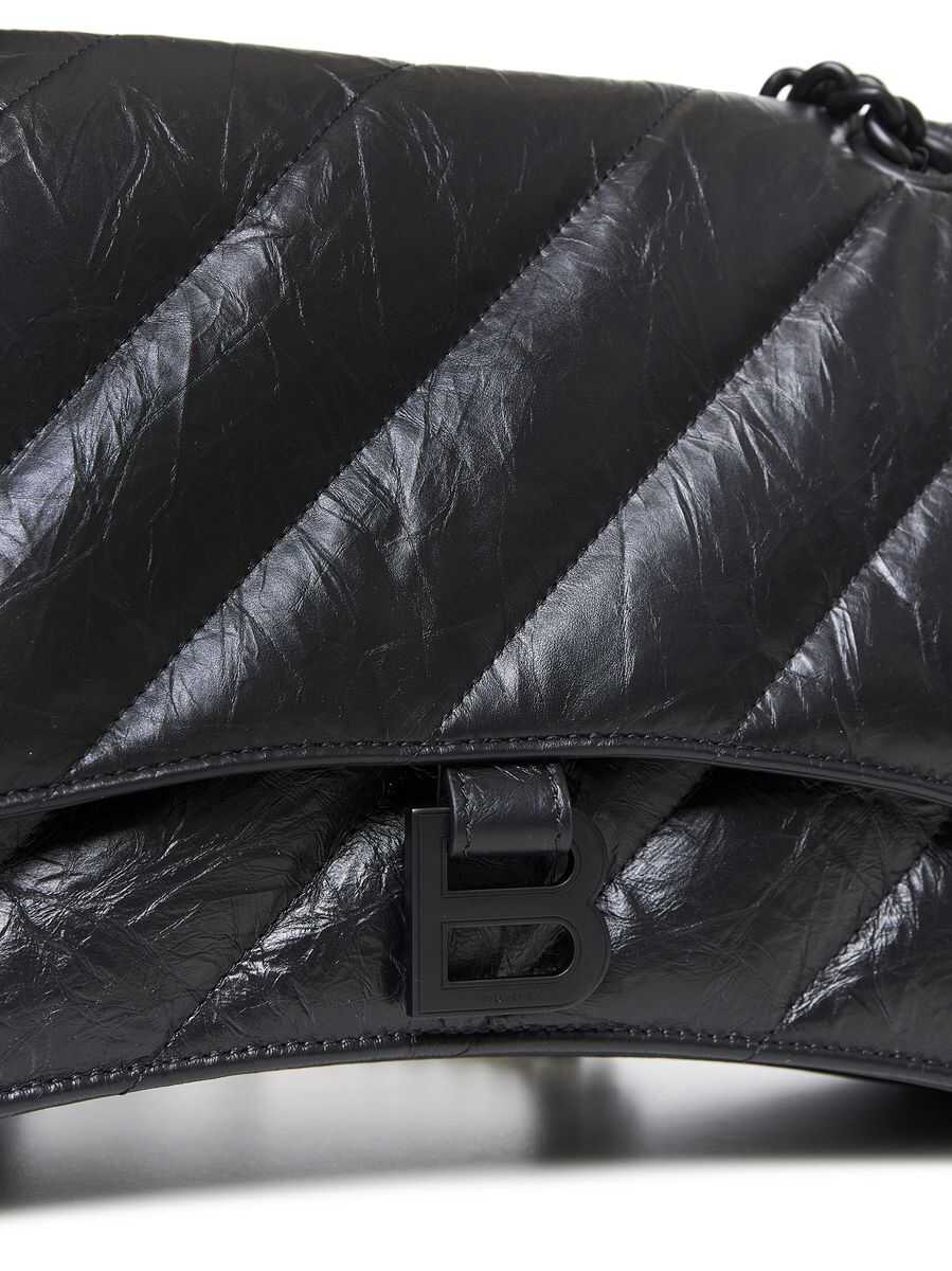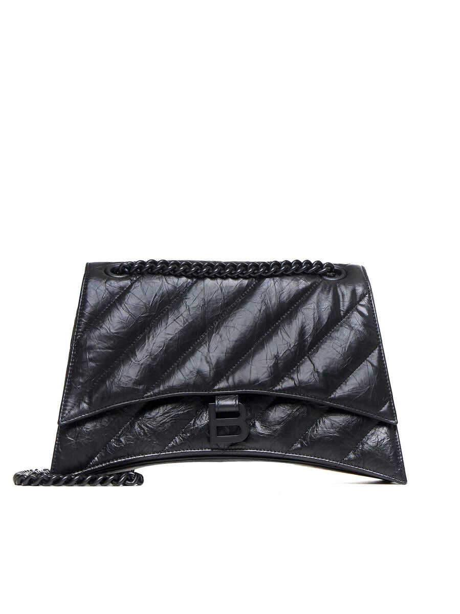 Balenciaga’s Crush Chain medium bag in supple black wrinkled effect leather featuring quilted diagonal striped motif, signature rounded silhouette, sliding chain shoulder strap, B logo plaque on the lapel, concealed magnetic fastening, internal zip pocket and silver-tone and black enameled metal hardware.