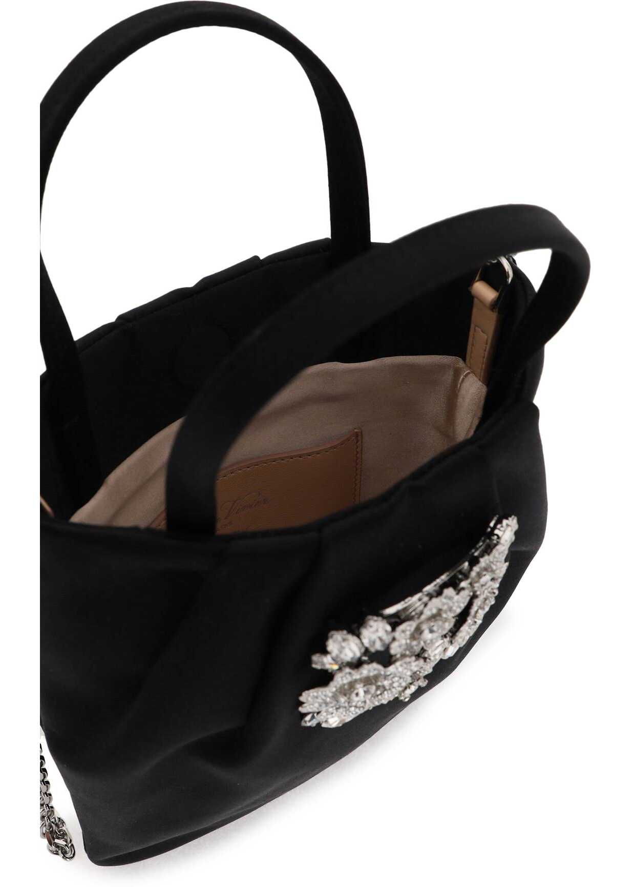 Micro Drapé Pocket bag from Roger Vivier made of satin with crystal Bouquet Strass buckle. Magnetic closure, satin interior with a leather card slot and silver metal chain handle.