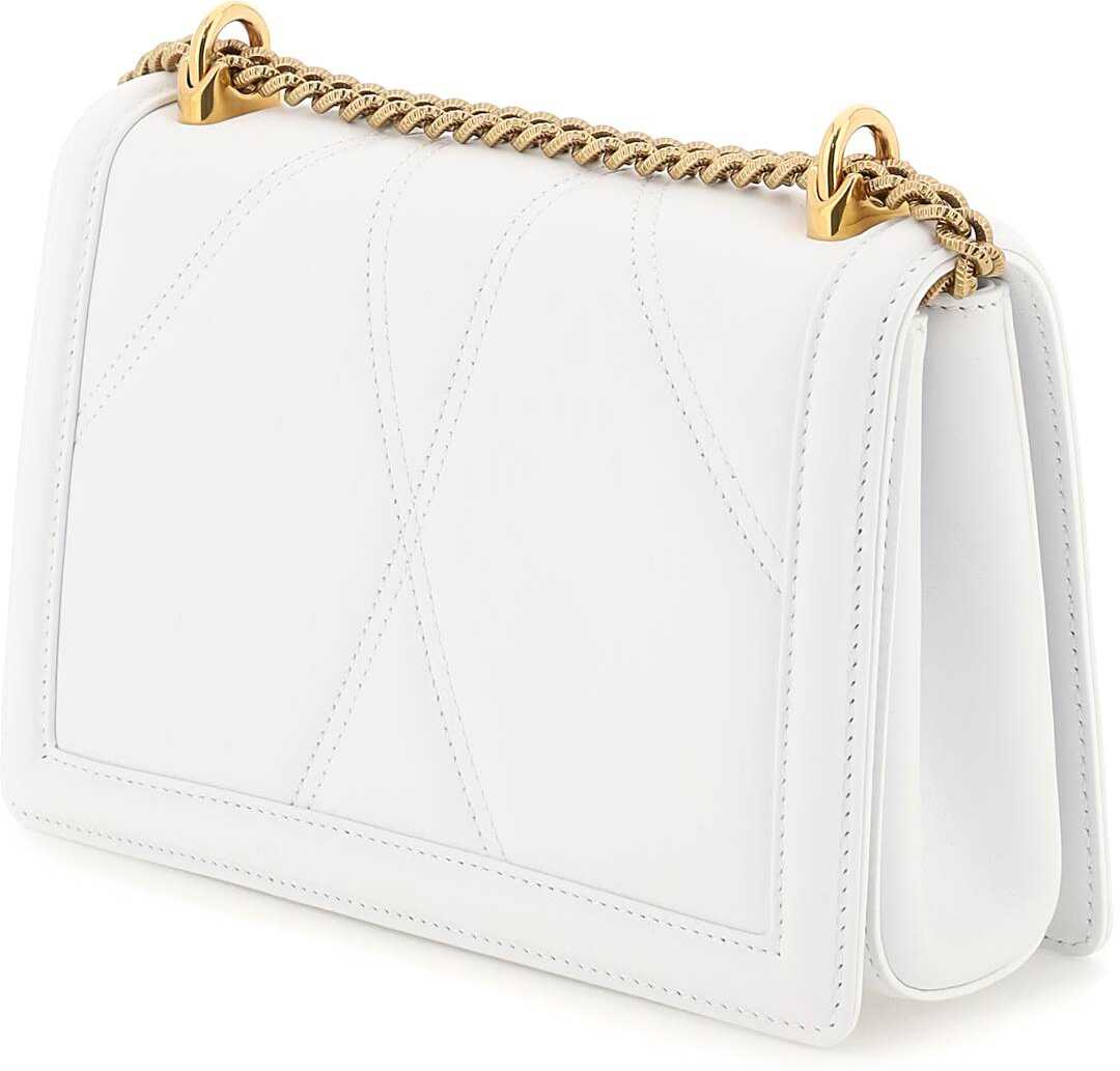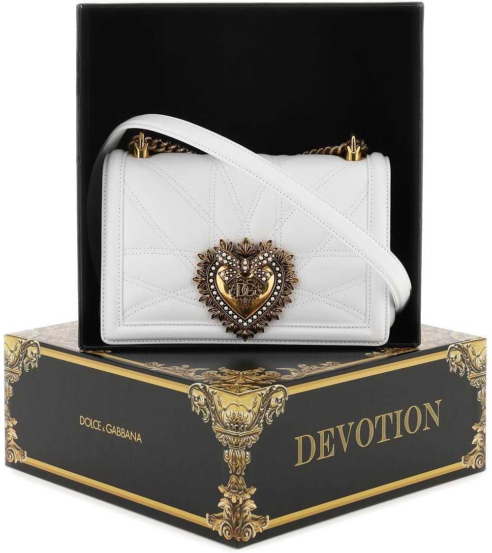Medium Devotion bag by Dolce and Gabbana made of quilted nappa leather with handmade metal heart featuring embedded pearls and central DG logo. Sliding chain strap with leather insert, clasp closure under the flap, leopard-patterned fabric lining and one inner flat pocket with zip closure. Antique gold-finished metalware. Devotion packaging included.