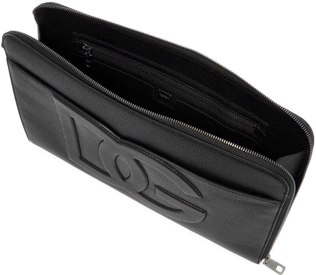 The large Dolce & Gabbana Logo pouch from the Logo line is made of hammered leather and features a three-dimensional embossed DG logo. It has a zip closure on two sides, a fabric interior with two open pockets and one zip pocket, and an additional open pocket on the front. The metal accessories have a ruthenium finish.