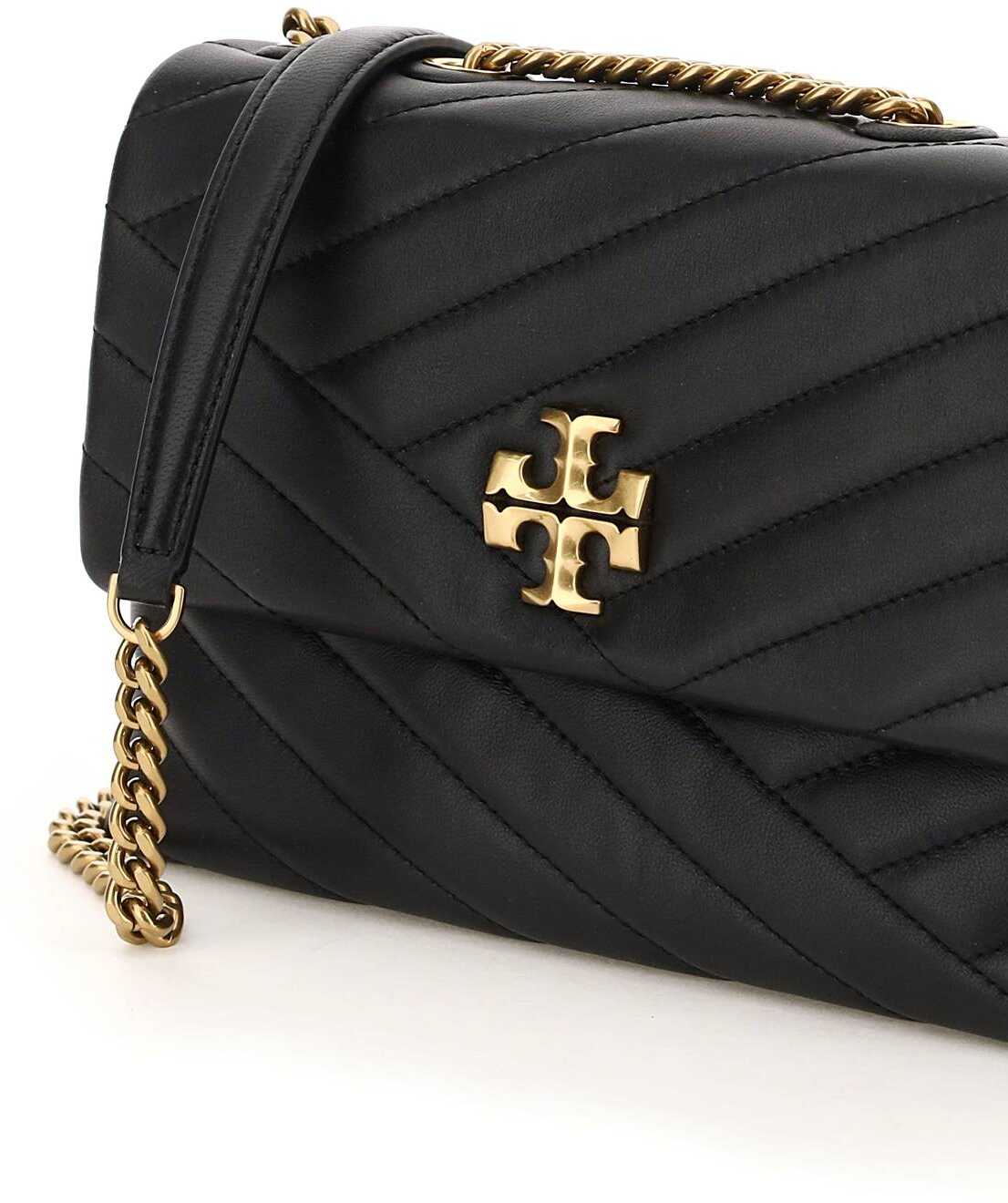 Small Kira shoulder bag by Tory Burch crafted in soft leather with chevron quilting. Flap with magnetic closure enriched with the iconic metal double T applied on front, adjustable chain shoulder strap with side leather inset. Fabric lining with one zippered pocket. Gold-finished metalware.