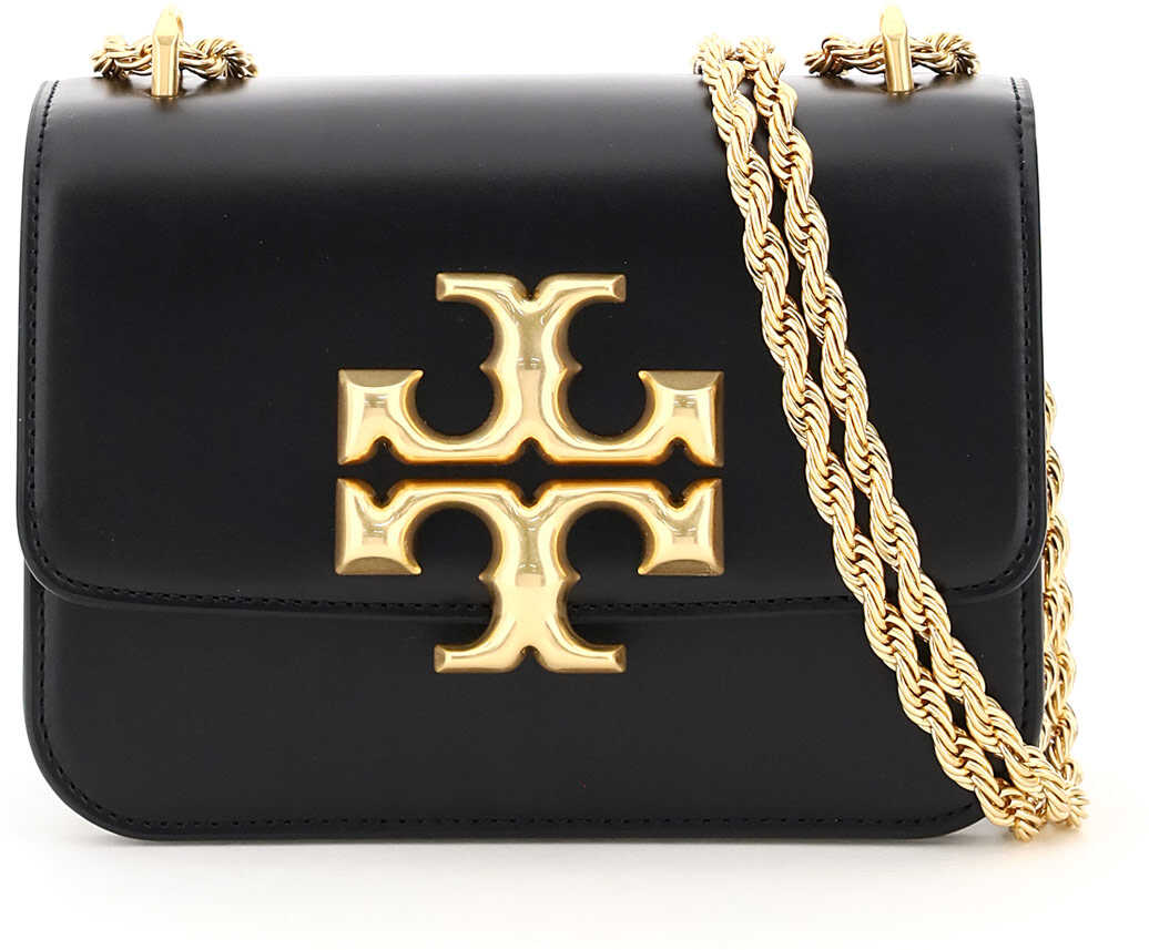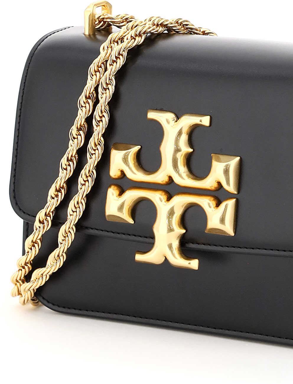 Tory Burch Eleanor small leather shoulder bag with a structured construction with flap, magnetic closure and the iconic embossed double T monogram. Sliding double-handle enhanced by a twisted chain with engraved monogram. Interior lined in contrasting leather with main gusset compartment, two flat compartments, one zip pocket. Gold-tone brass hardware.