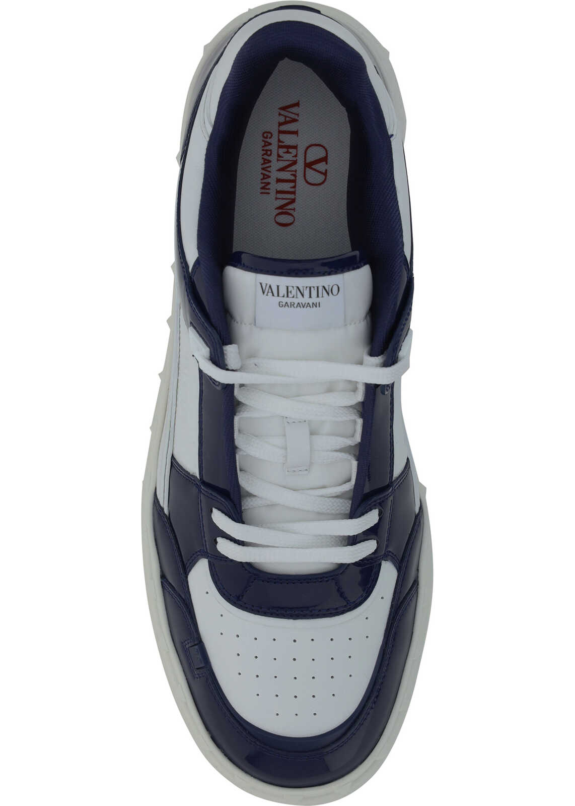Calfskin Freedots Sneakers by Valentino Garavani, round toe flat sole with iconic Rockstud studs embossed throughout, contrasting iconic brand monogram on front tongue, lace-up closure.