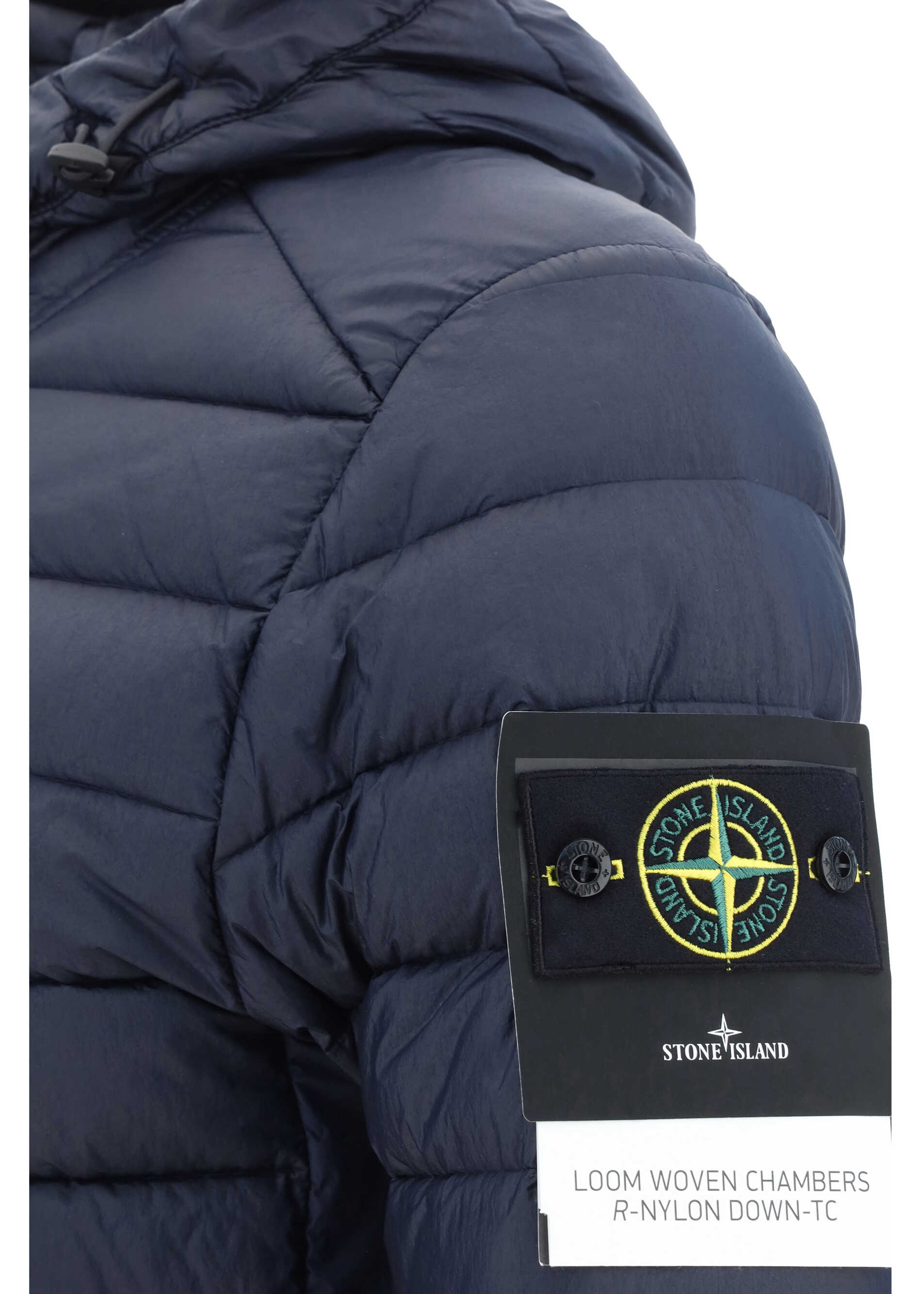 Down Jacket by Stone Island, high neck with hood, front closure by double-slider zipper, two side welt pockets, elasticized cuffs, elasticized hem, contrasting embroidered iconic brand logo patch on sleeve, all-over quilted and padded design, monochrome pattern, regular fit.
