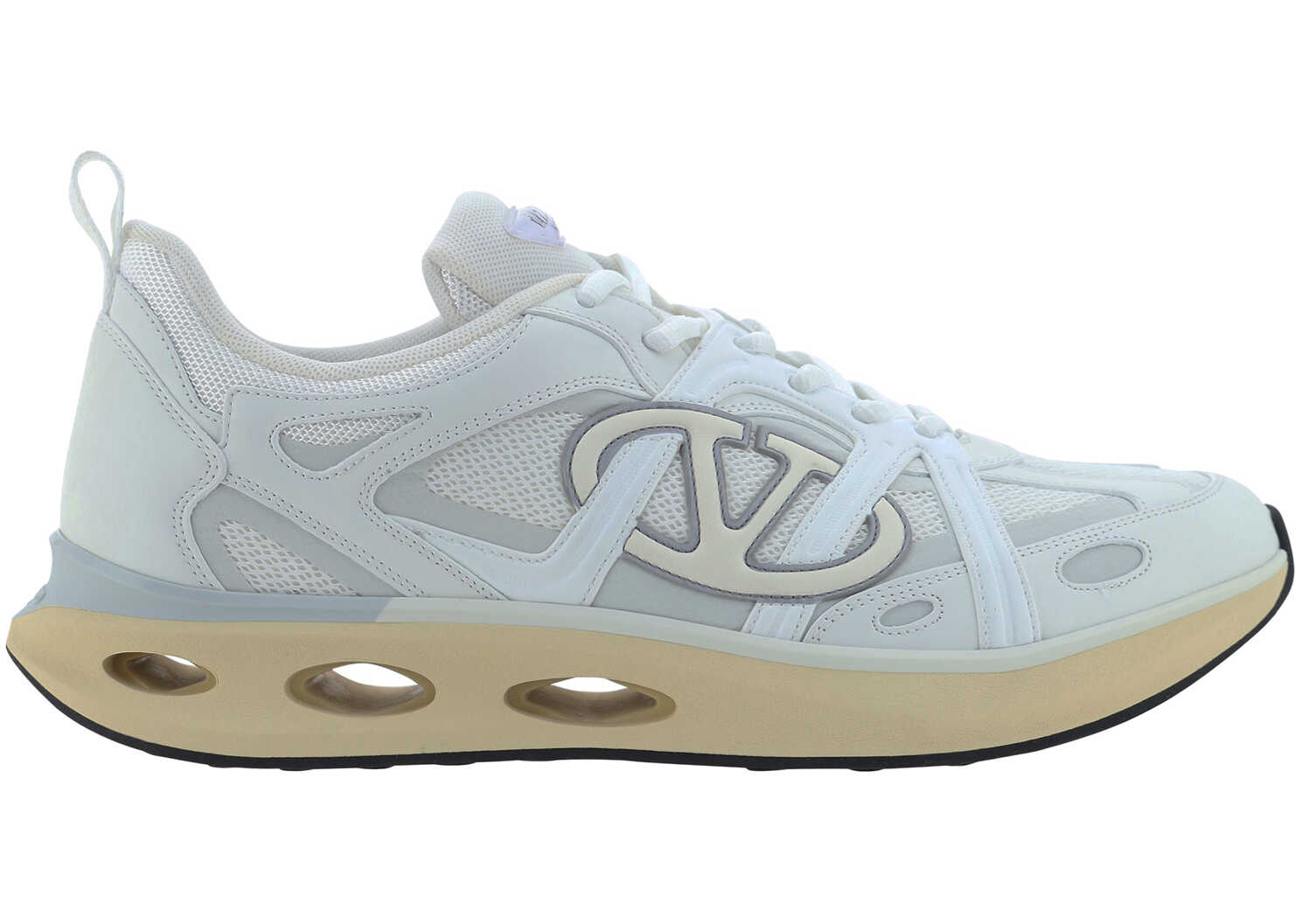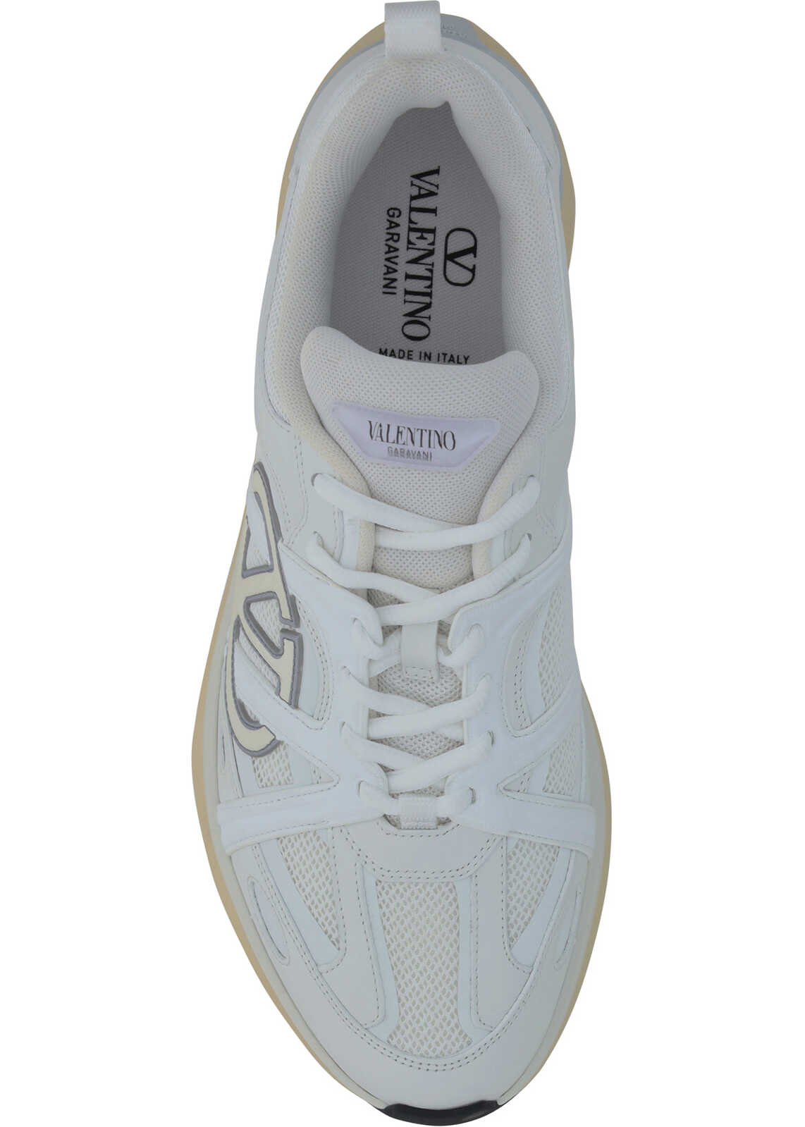 VLogo Easyjog Sneakers by Valentino Garavani, elongated toe, iconic three-dimensional logo appliqué on side panels, textured sole with cut-out inserts, front lace-up closure, heel pull for easy fit.