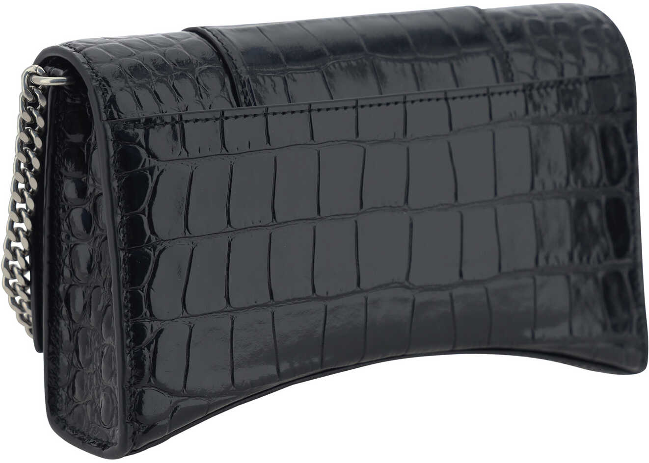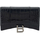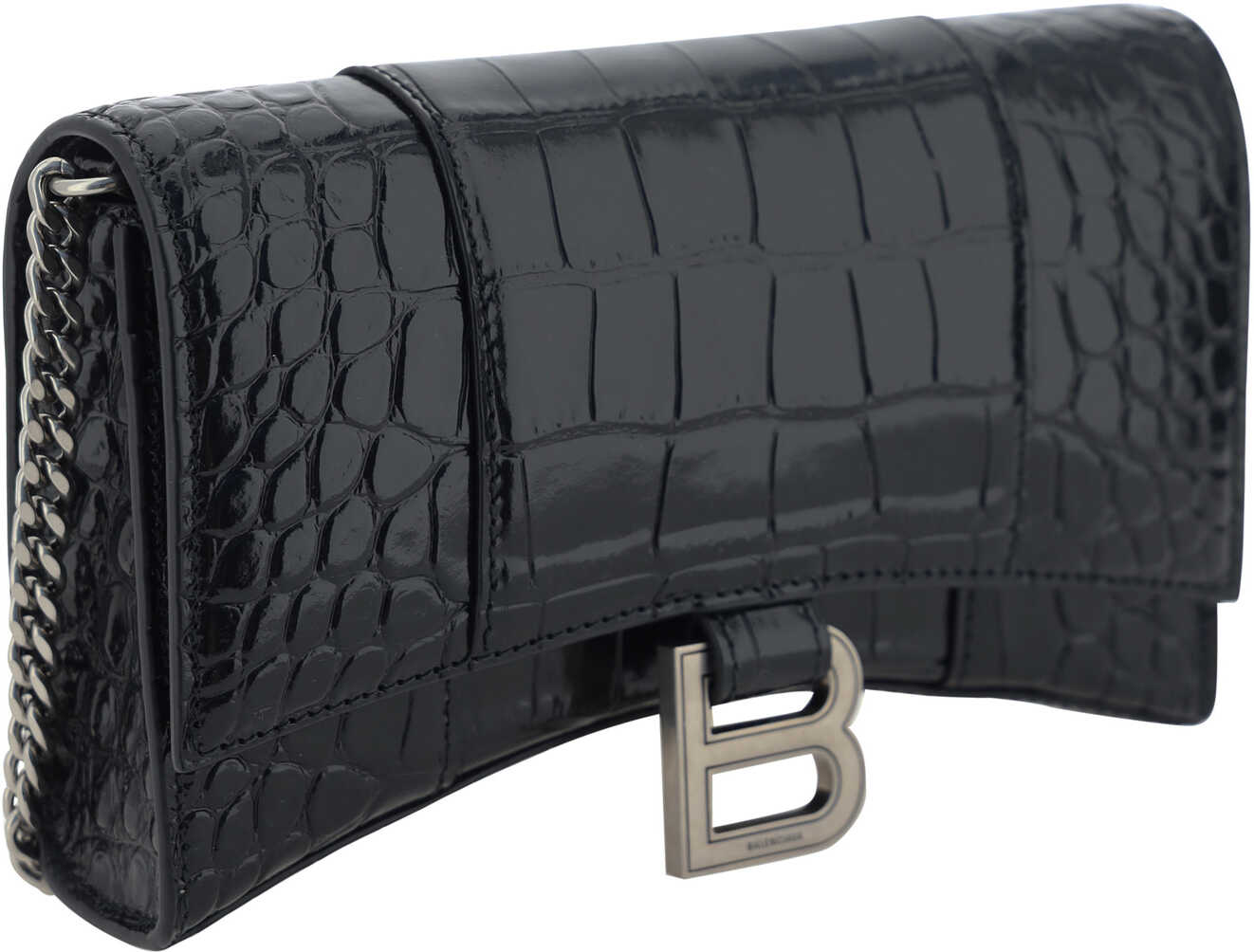 Calfskin Hour Wallet by Balenciaga, front magnetic button closure, iconic antiqued brass brand monogram on front for closure, chain shoulder strap, interior card slot, bill compartments, interior coin pocket with zipper closure.