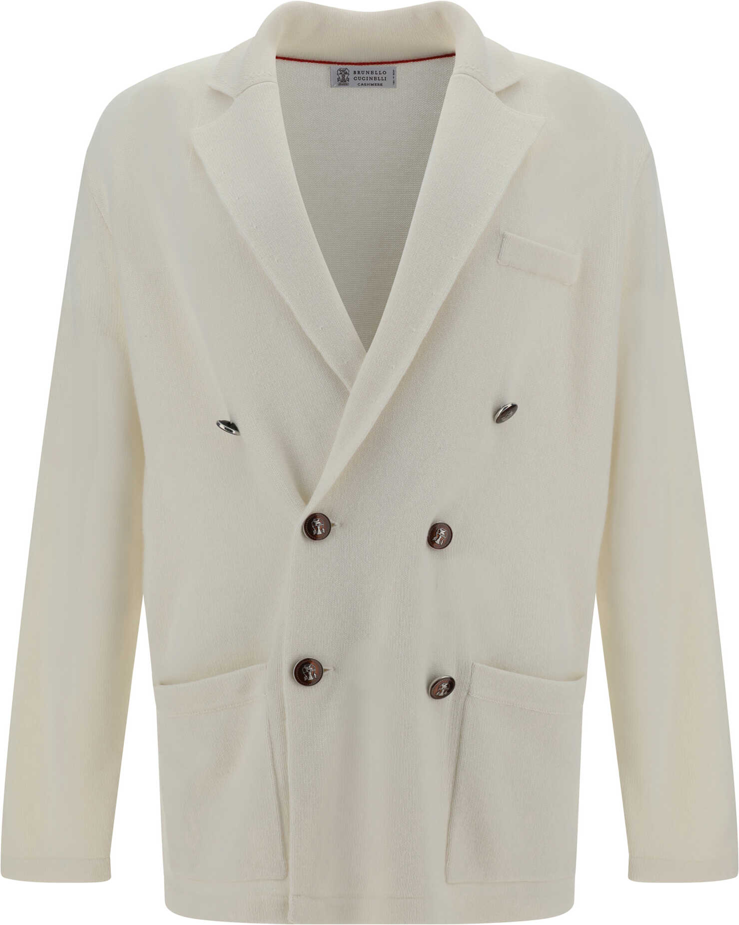 Cashmere Blazer Jacket by Brunello Cucinelli, featuring a double-breasted front closure with contrasting buttons, classic lapels, two front patch welt pockets, a front welt pocket, a monochrome pattern, and a regular fit.