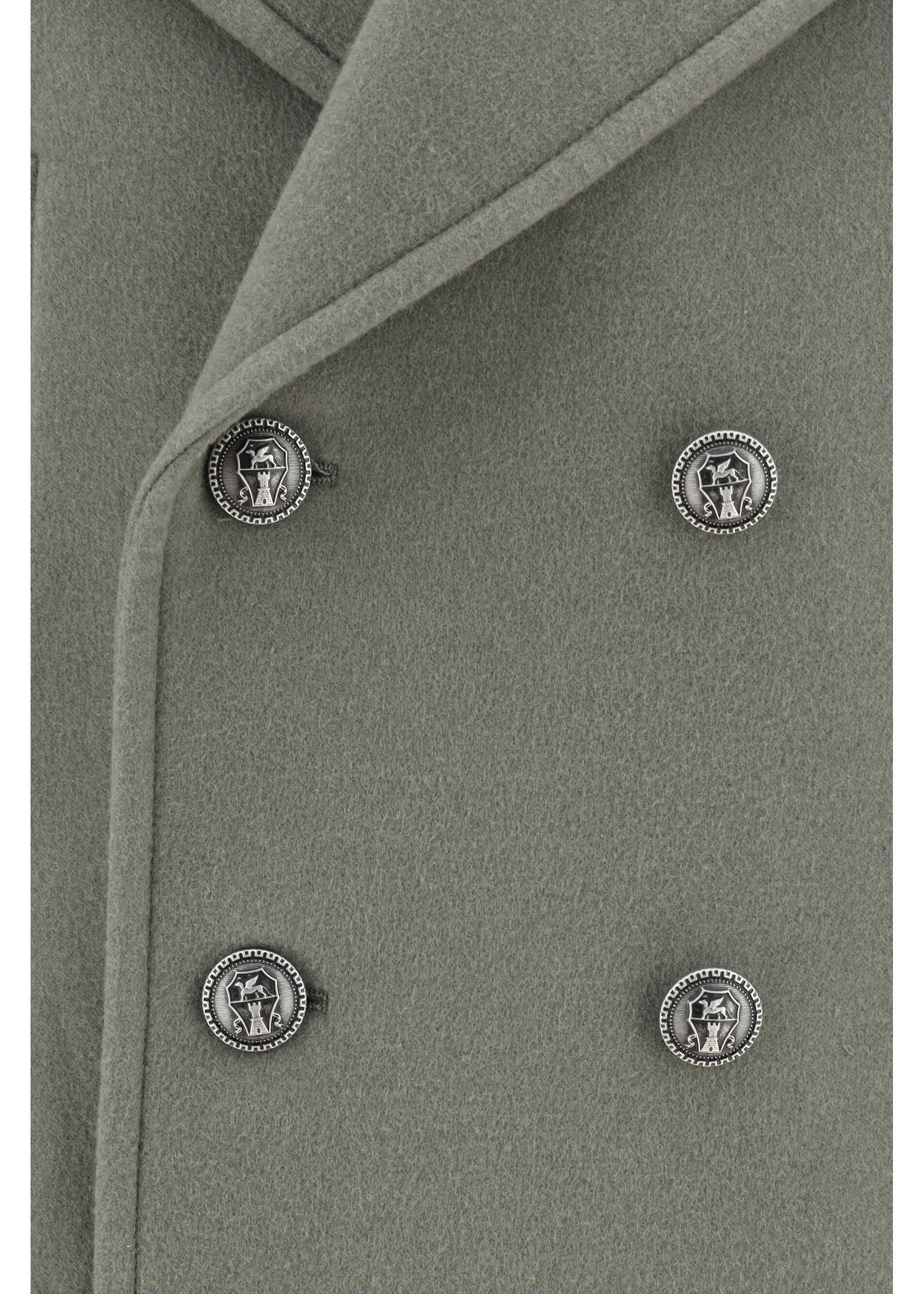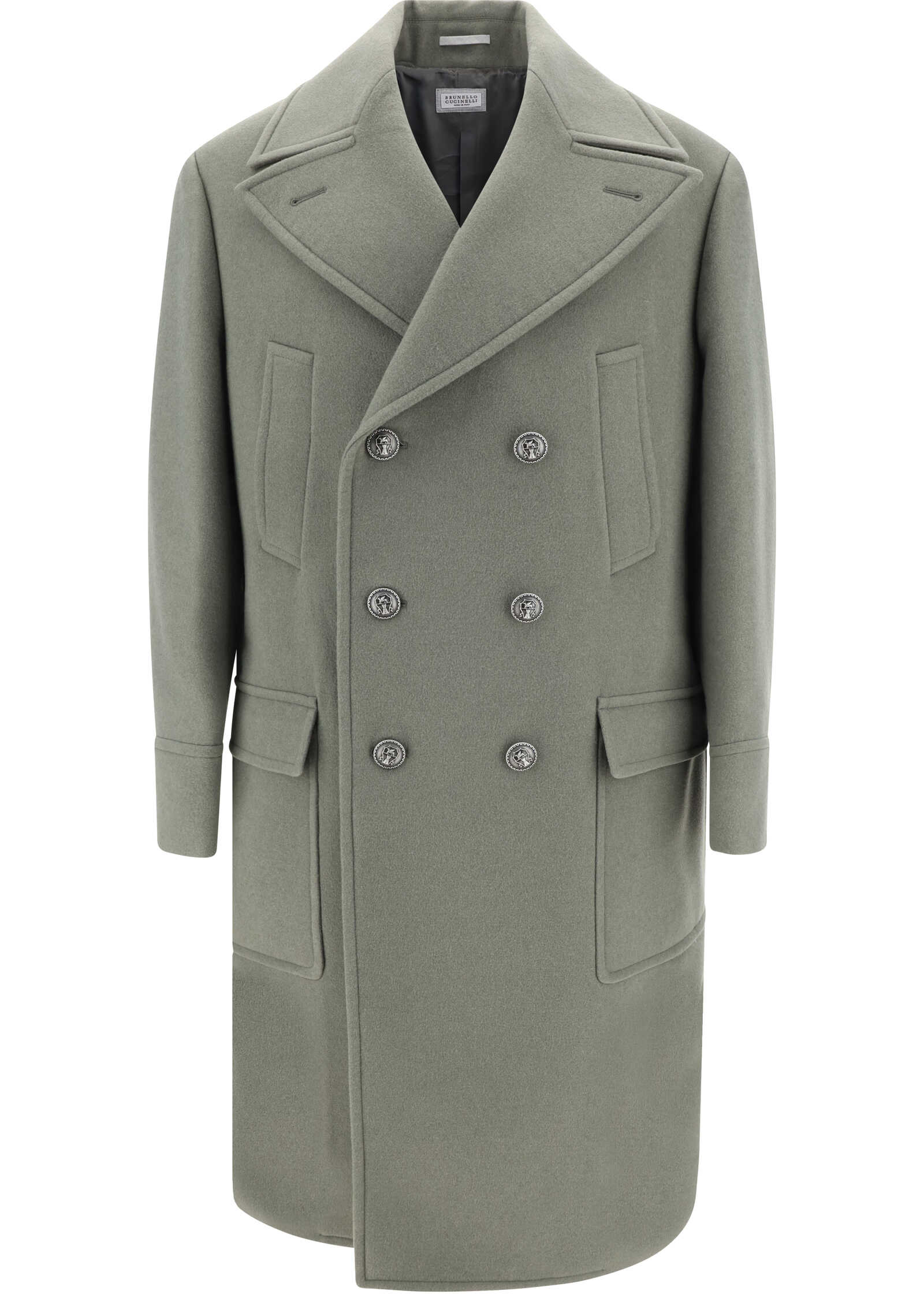 Wool Coat by Brunello Cucinelli, featuring a double-breasted front closure with contrasting buttons, spear lapels, two side welt pockets with patch flap, two slit pockets on the front, back slit, structured shoulders, regular fit.