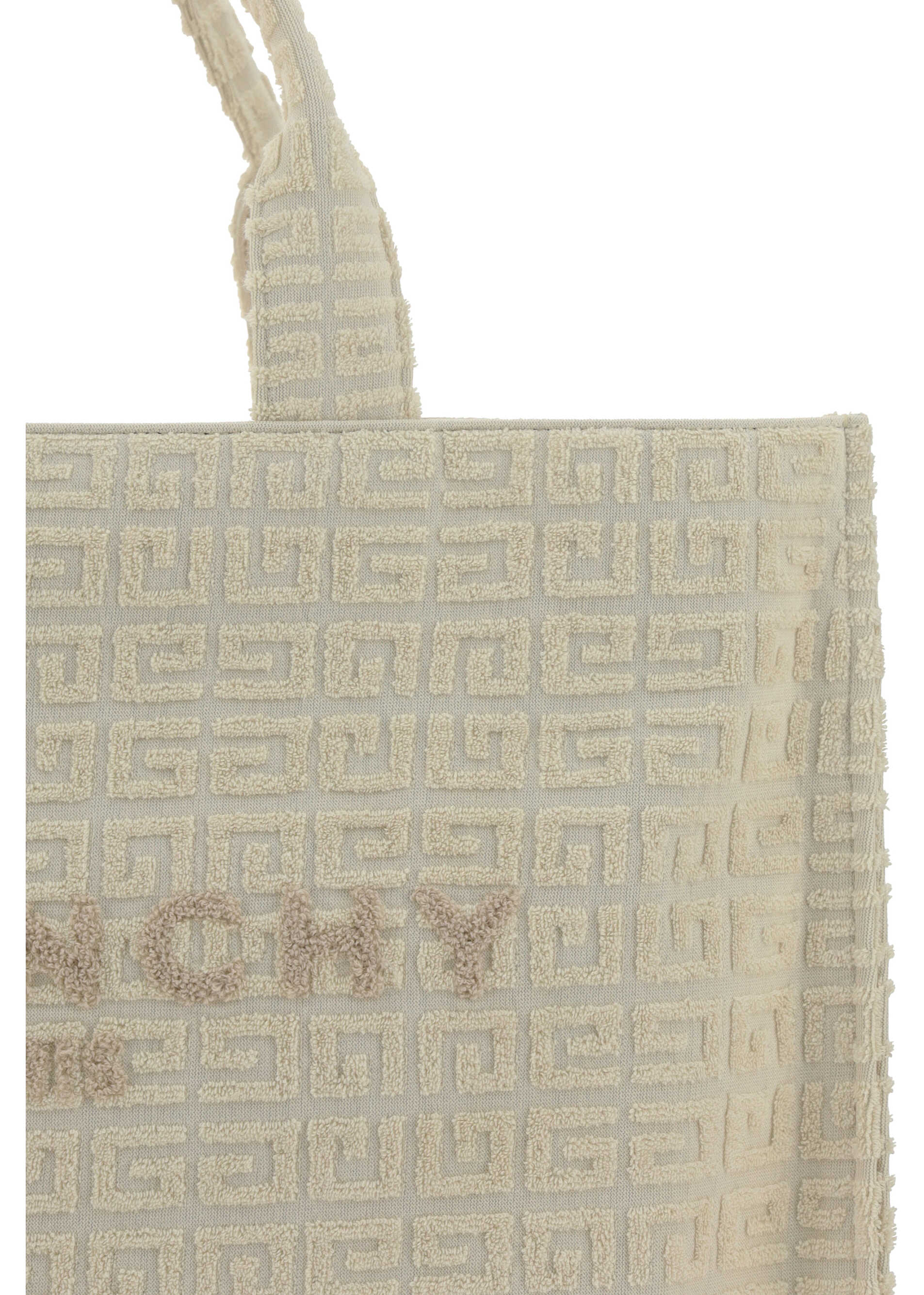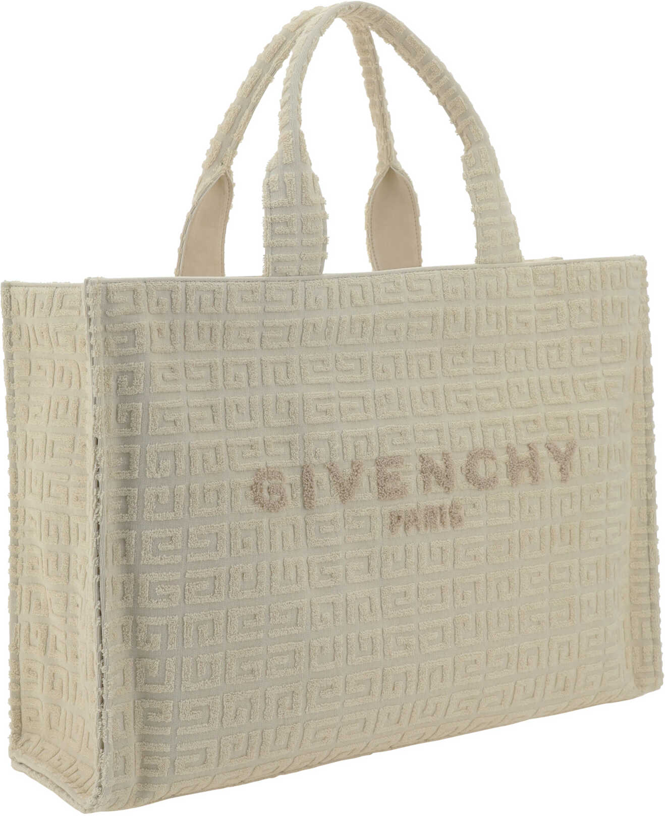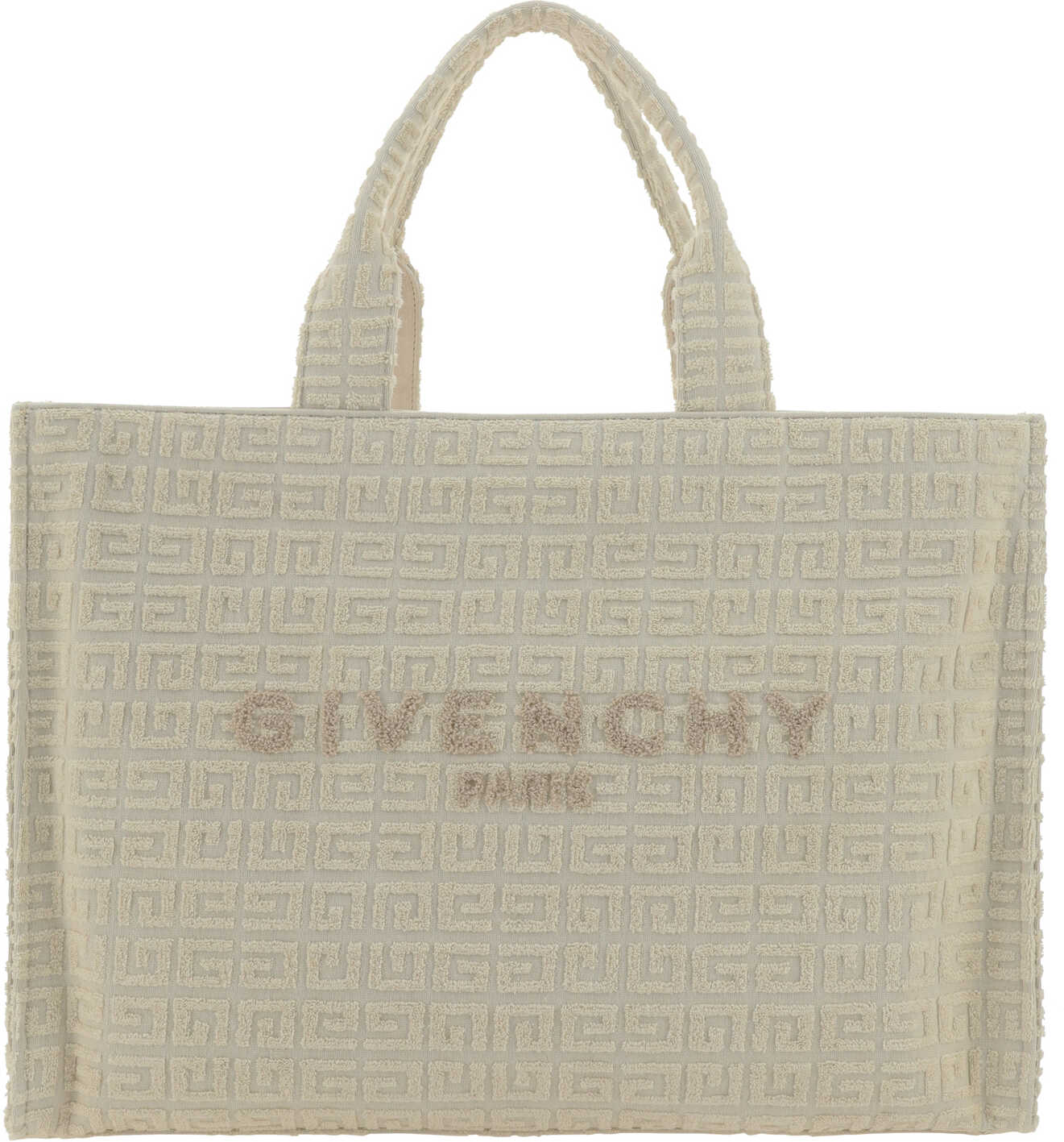 Cotton Soft G-Tote Bag by Givenchy, soft cotton terry design, double round top handle, iconic brand monogram embossed on front, single interior compartment, interior welt pocket, iconic 4G logo repeated iall-over.