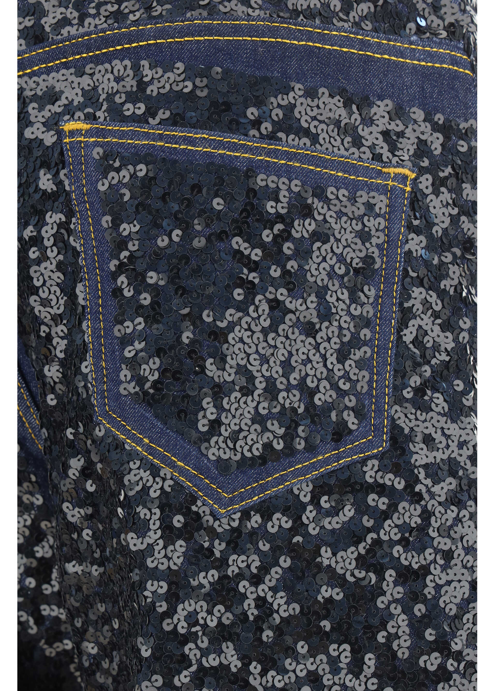 Cotton Guff Pants by P.A.R.O.S.H., denim design, straight five-pocket style, front button and zipper closure, waistband loops, all-over appliqué bright sequin detail, regular fit.
