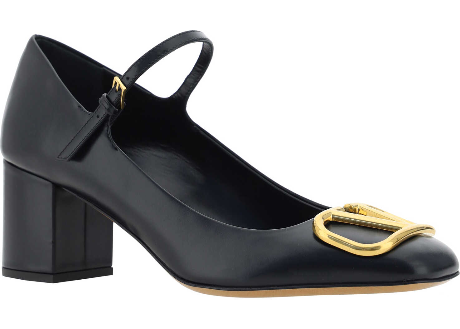 Calfskin Mary Jane Pumps by Valentino Garavani, leather chunky heel, almond toe on front embellished with three-dimensional plaque with iconic VLogo, adjustable leather appliqué strap on back of foot, logoed insole.