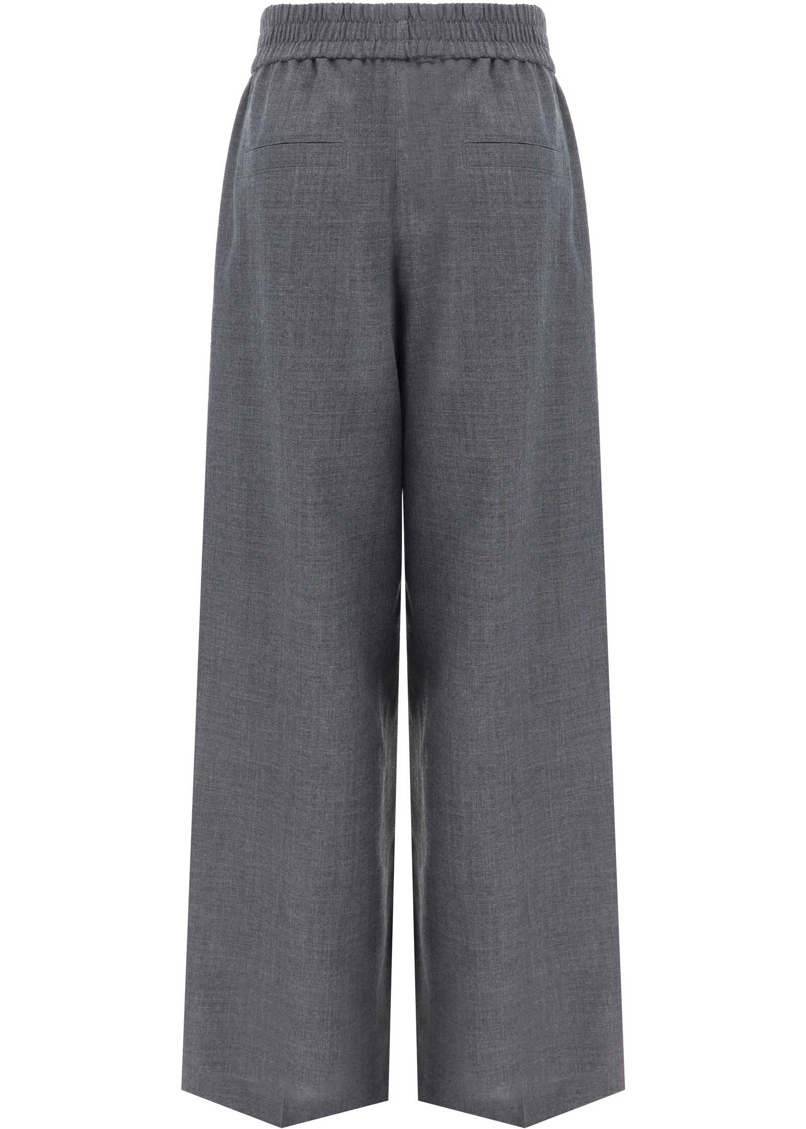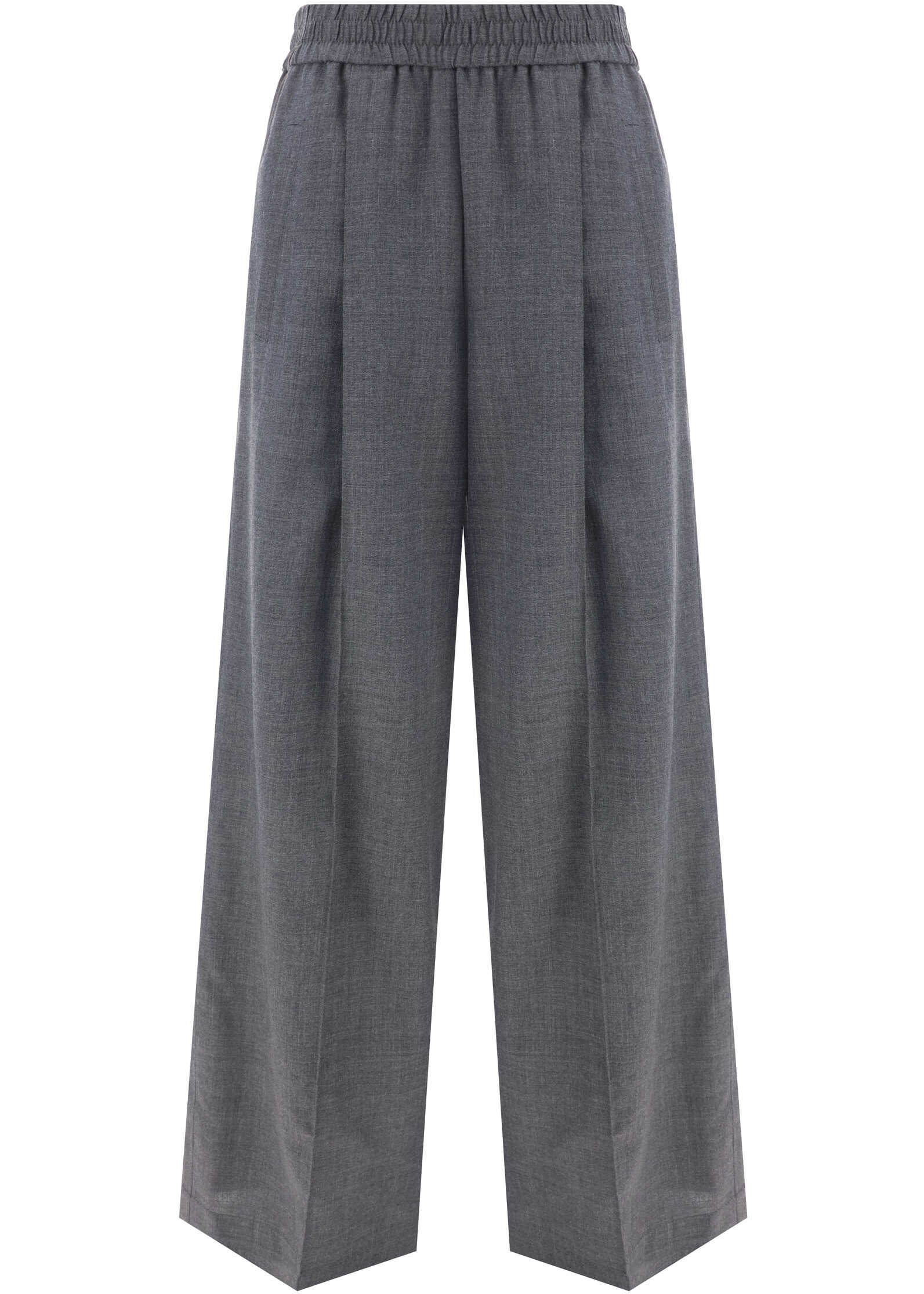 Virgin Wool Loose Track Pants by Brunello Cucinelli, wide-leg style, elasticized waistband, two side welt pockets, two back slit pockets, monochrome pattern, regular fit.