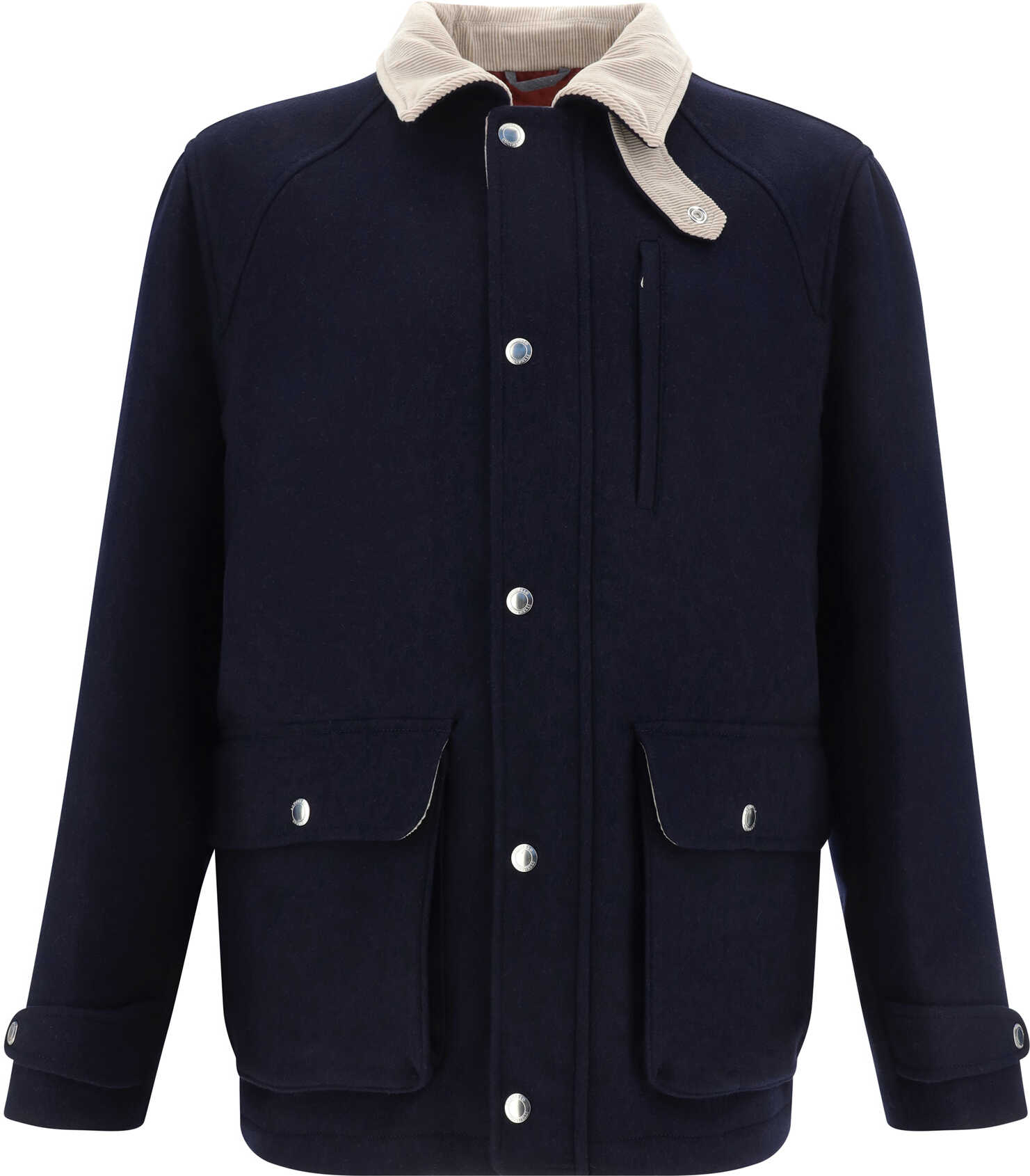 Wool Jacket by Brunello Cucinelli, contrasting velvet classic collar, zipper and button front closure, two flap patch pockets on front, vertical zipper pocket on front panel, monochrome pattern, regular fit.