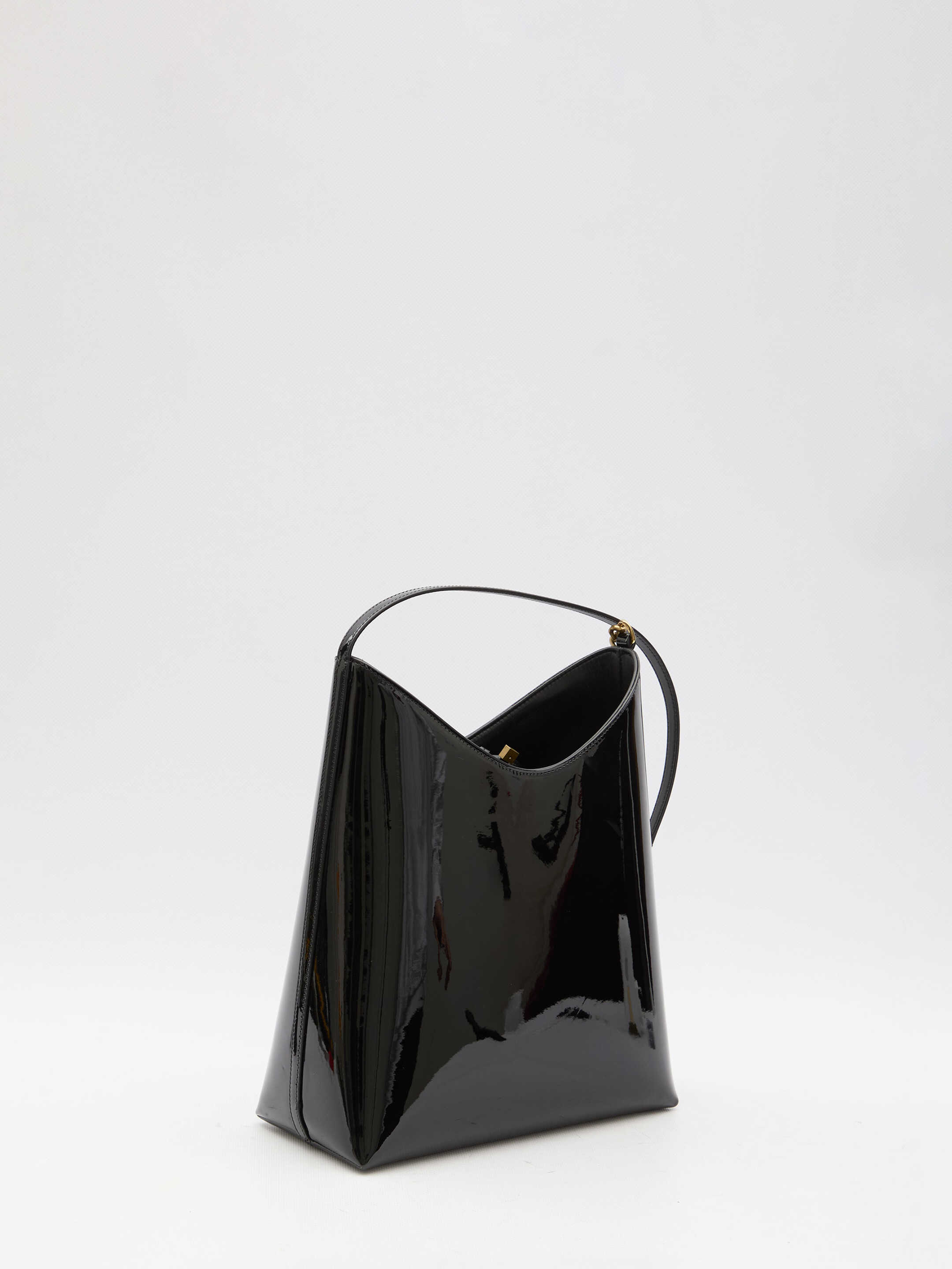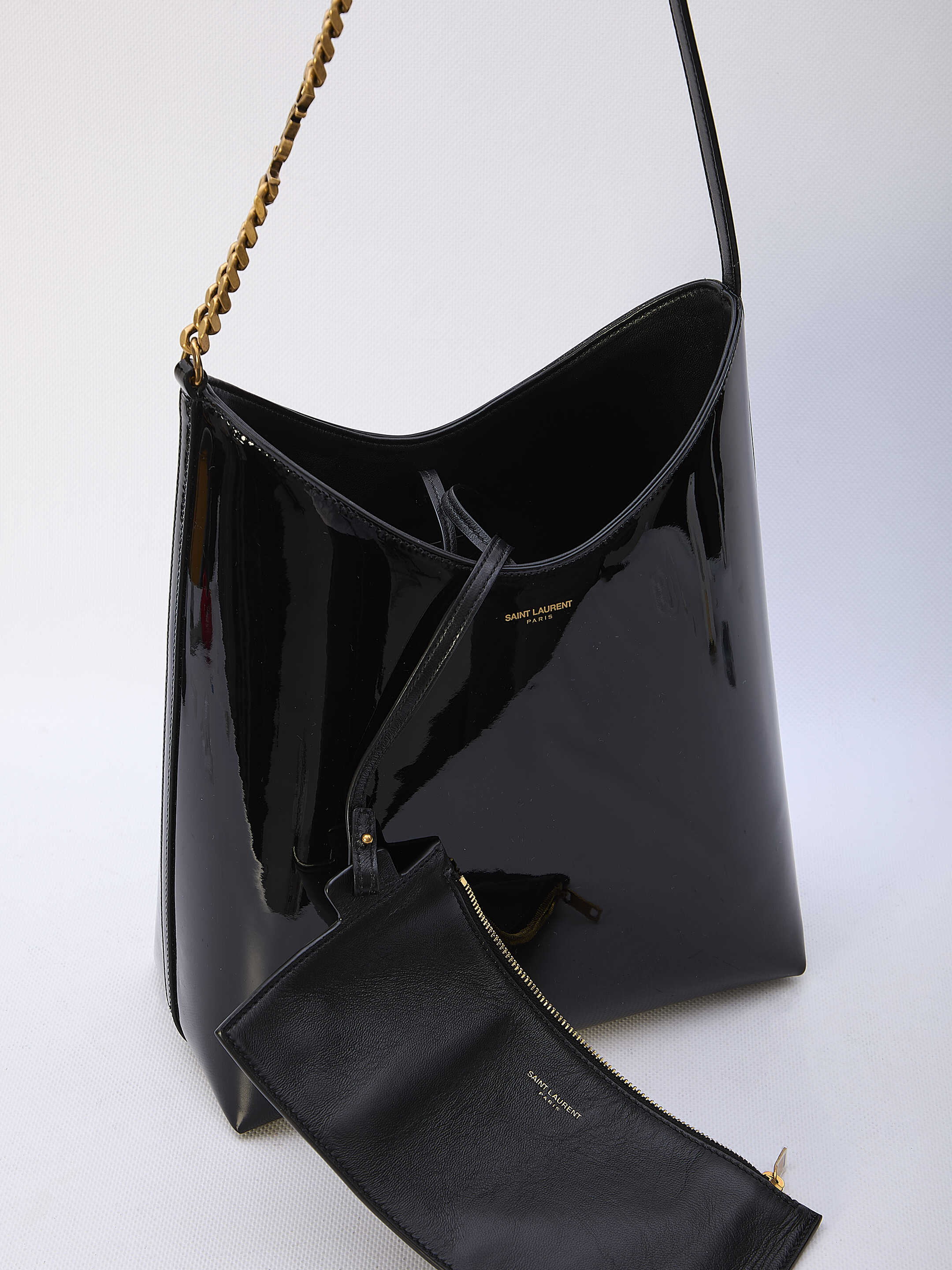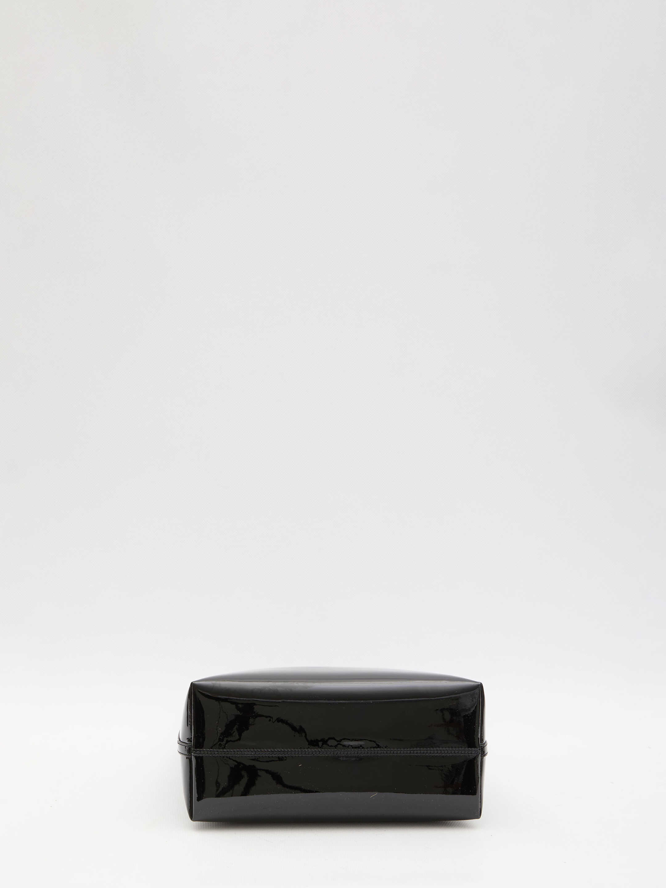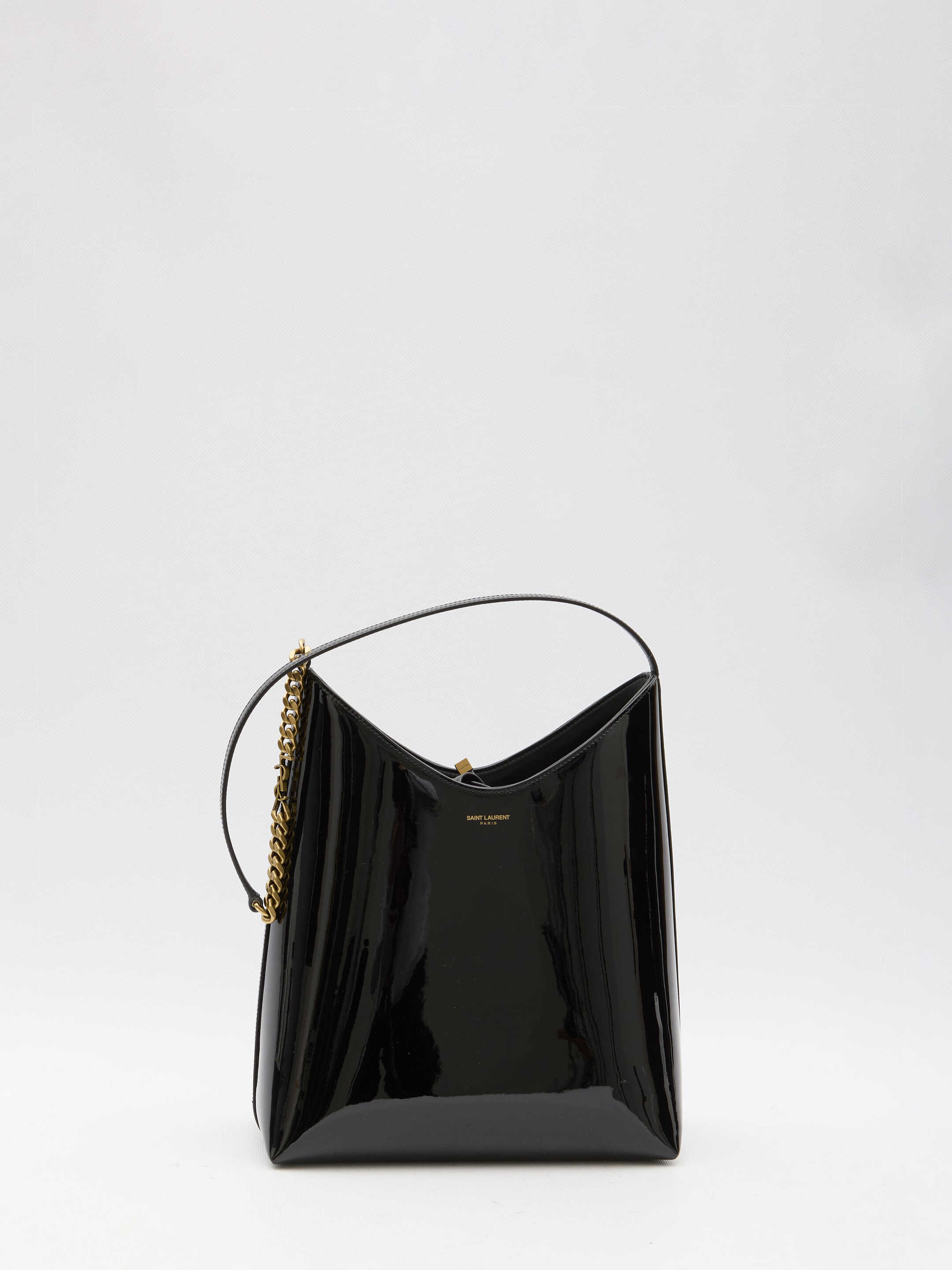 Rendez-Vous bag in black patent leather with embossed Saint Laurent Paris signature on the front. It features leather and chain handle with Cassandre detail, lace closure, one main interior compartment and one interior zipped pouch. Any leather imperfections are not to be considered manufacturing defects, but a peculiarity of the material.