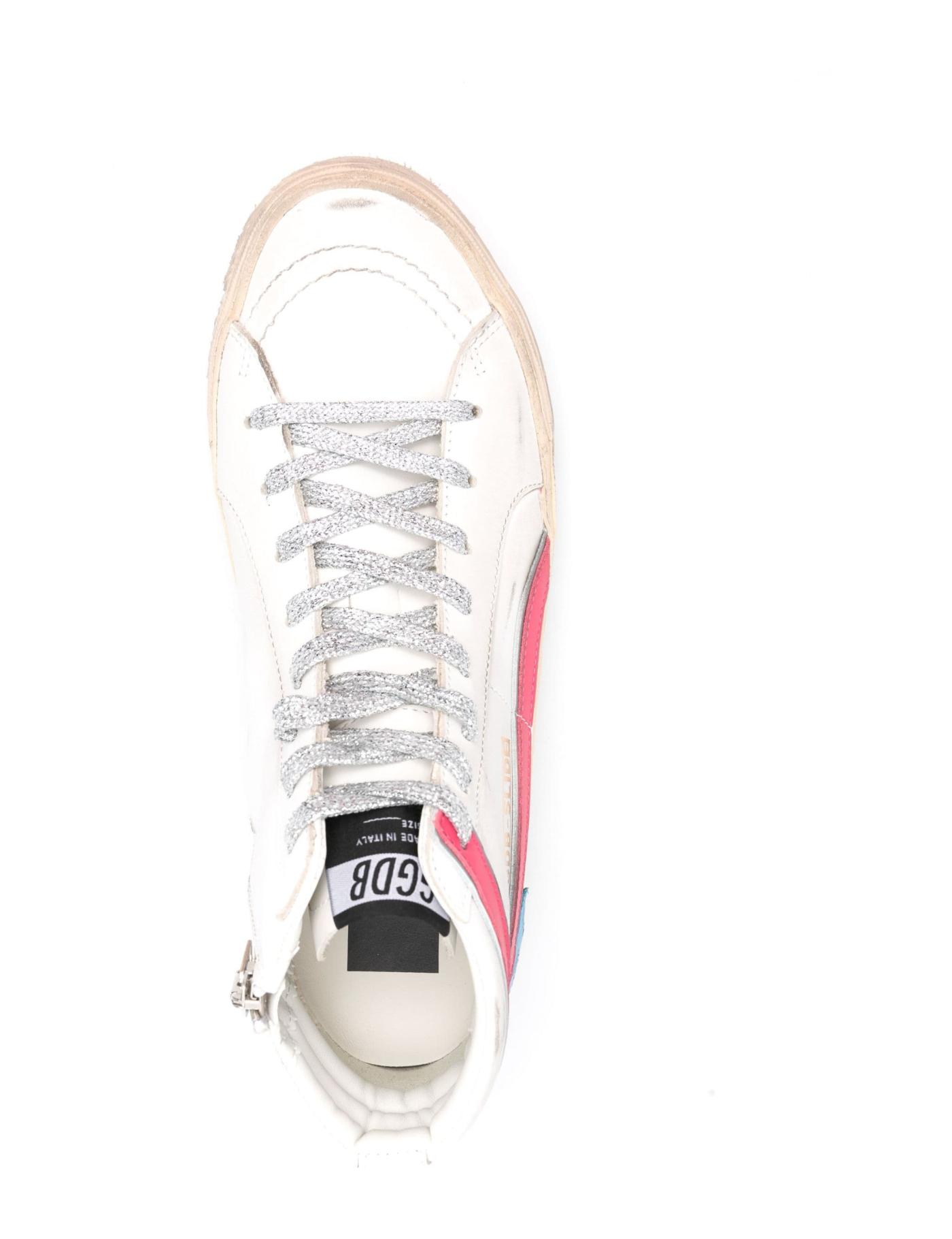 Slide high-top sneakers are Golden Goose’s take on grungy aesthetics – a refined style that embodies artisanal craftsmanship. Maintaining all the signature elements of the brand, like the star patches and the distressed effect, but on different proportions, this model adds ankle length.