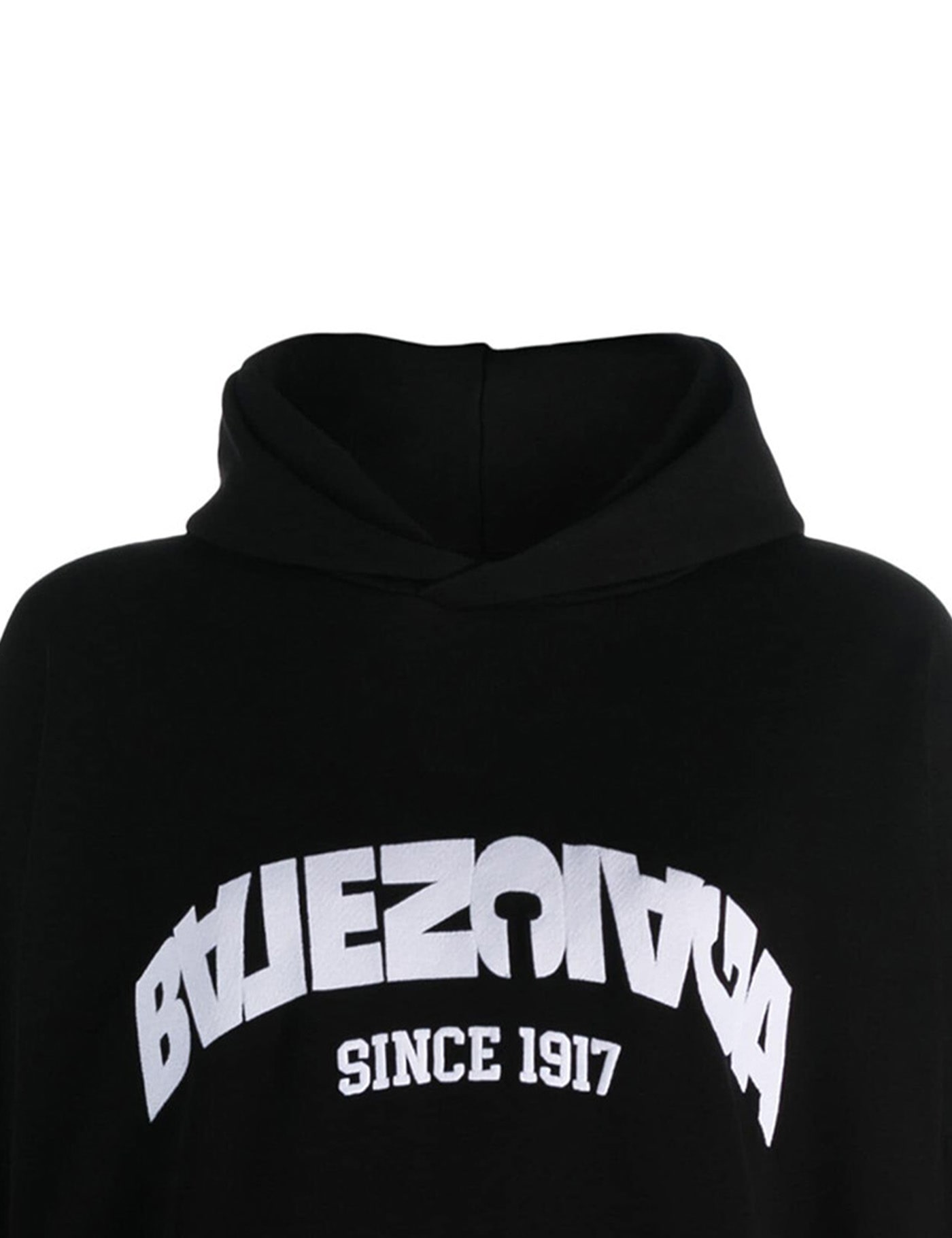 Sweatshirt in black cotton, hood, kangaroo pockets, long sleeves, ribbed cuffs and bottom, logo print on front, 100% cotton, Made in Portugal, oversize fit