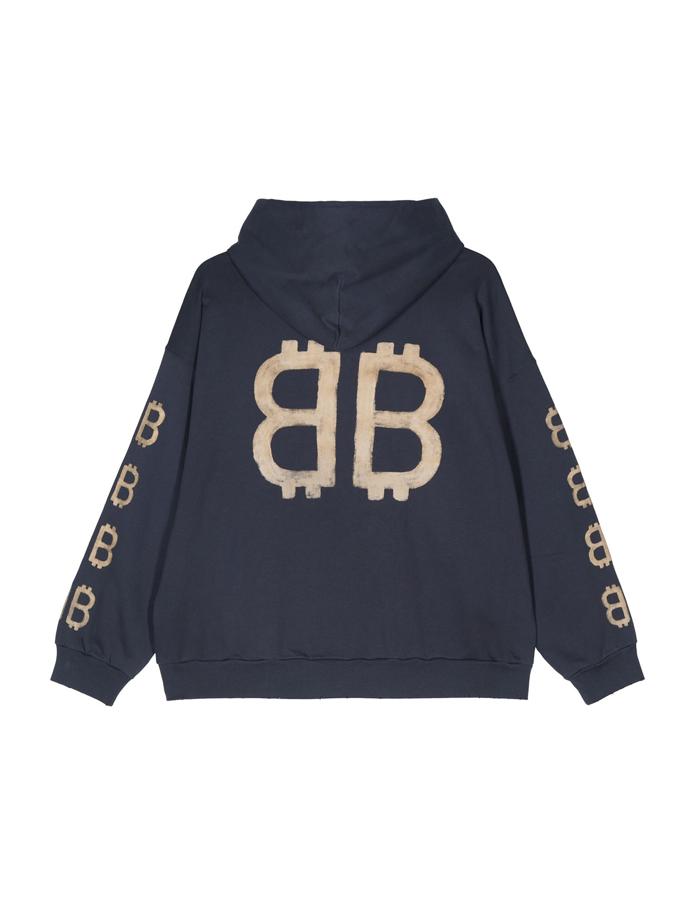 navy blue cotton jersey texture distressed finish slouchy hood drop shoulder long sleeves logo print at the sleeve logo print to the front front pouch pocket logo print to the rear ribbed cuffs and hem French terry lining When buying this unisex item, keep in mind that it is graded in standard men's sizing
