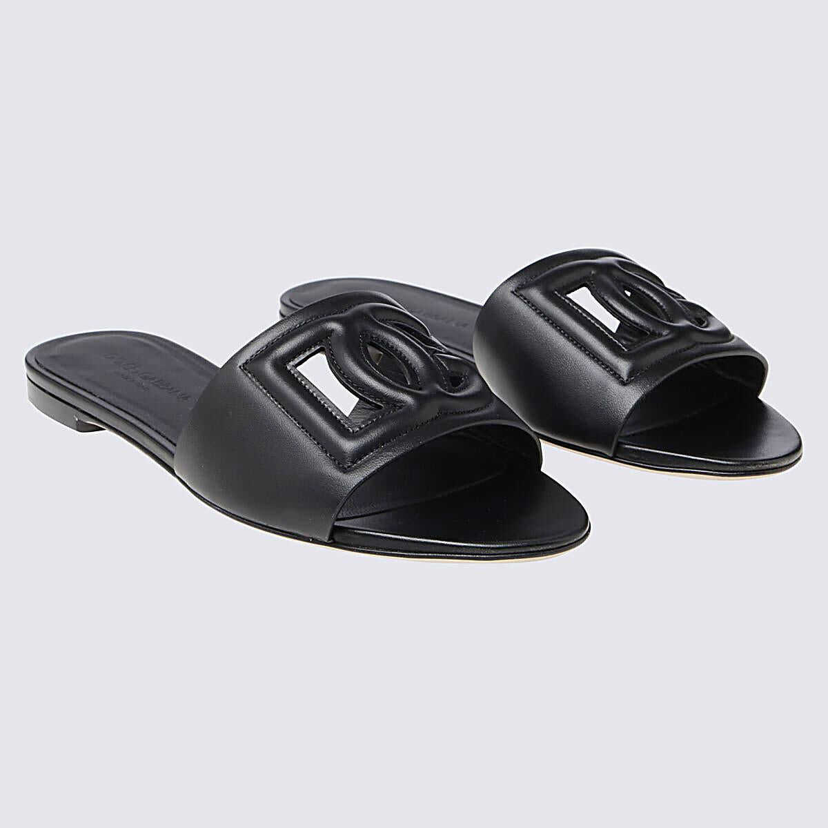 Black leather DG Millennials flats from Dolce & Gabbana featuring round toe, slip-on style, debossed logo, DG cut-out detail and flat sole.
