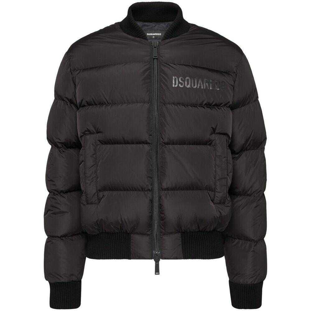 Black padded design duck down logo print at the chest ribbed band collar front zip fastening two side welt pockets long sleeves ribbed cuffs straight hem