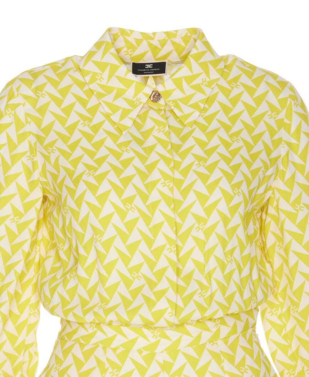 Elisabetta Franchi yellow and white jumpsuit, lateral zip and buttons closure, frontal buttons, V-neck, all over print logo, long sleeves, bow detail on cuffs, EU SIZE (IT)