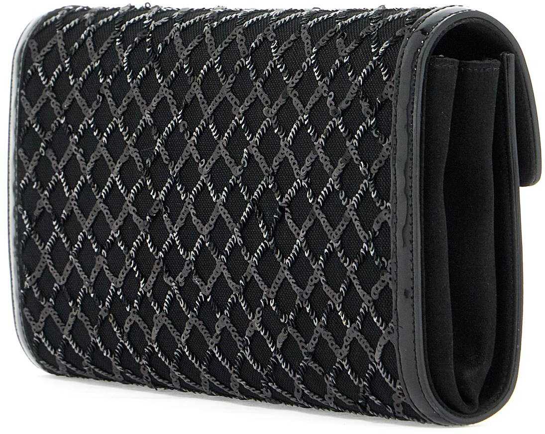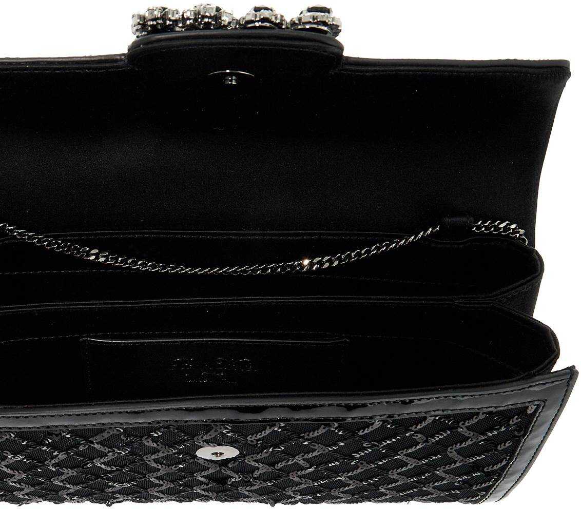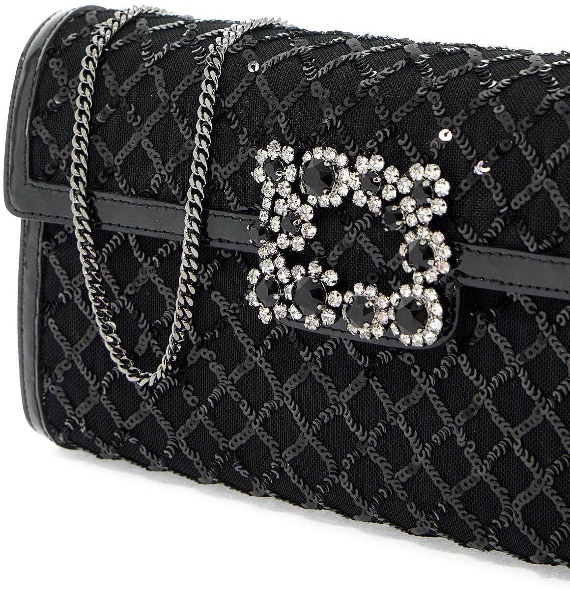 The Clutch Envelope Flap by Roger Vivier is made of mesh with patent trim and satin sides in a silk blend. The design is embellished with an all-over diamond sequin pattern and the Flower buckle with crystal detailing on the flap. It features a magnetic button closure, a satin-lined interior with two compartments and a smooth leather credit card slot, and a thin chain shoulder strap for a crossbody look. Metal accessories have a ruthenium finish.