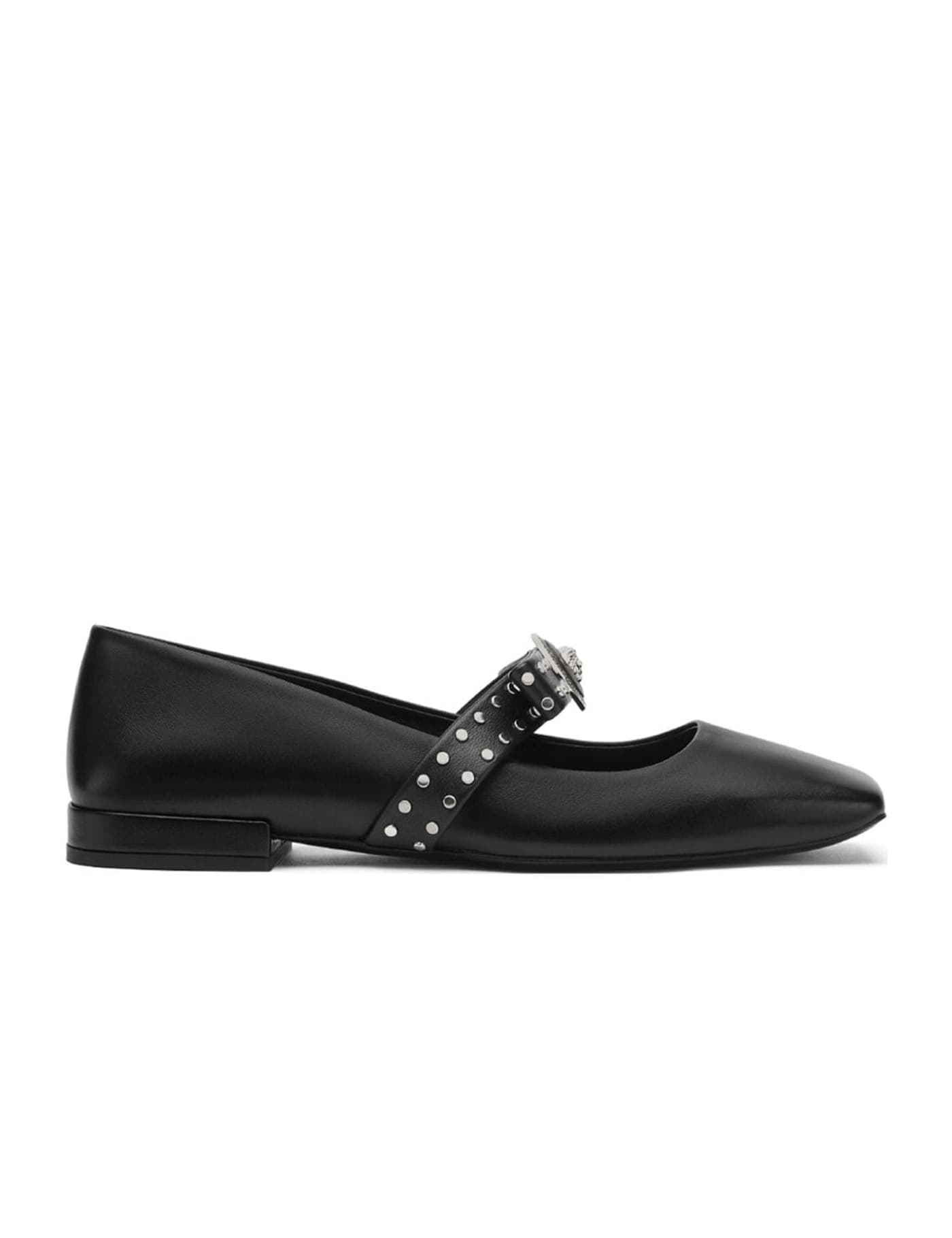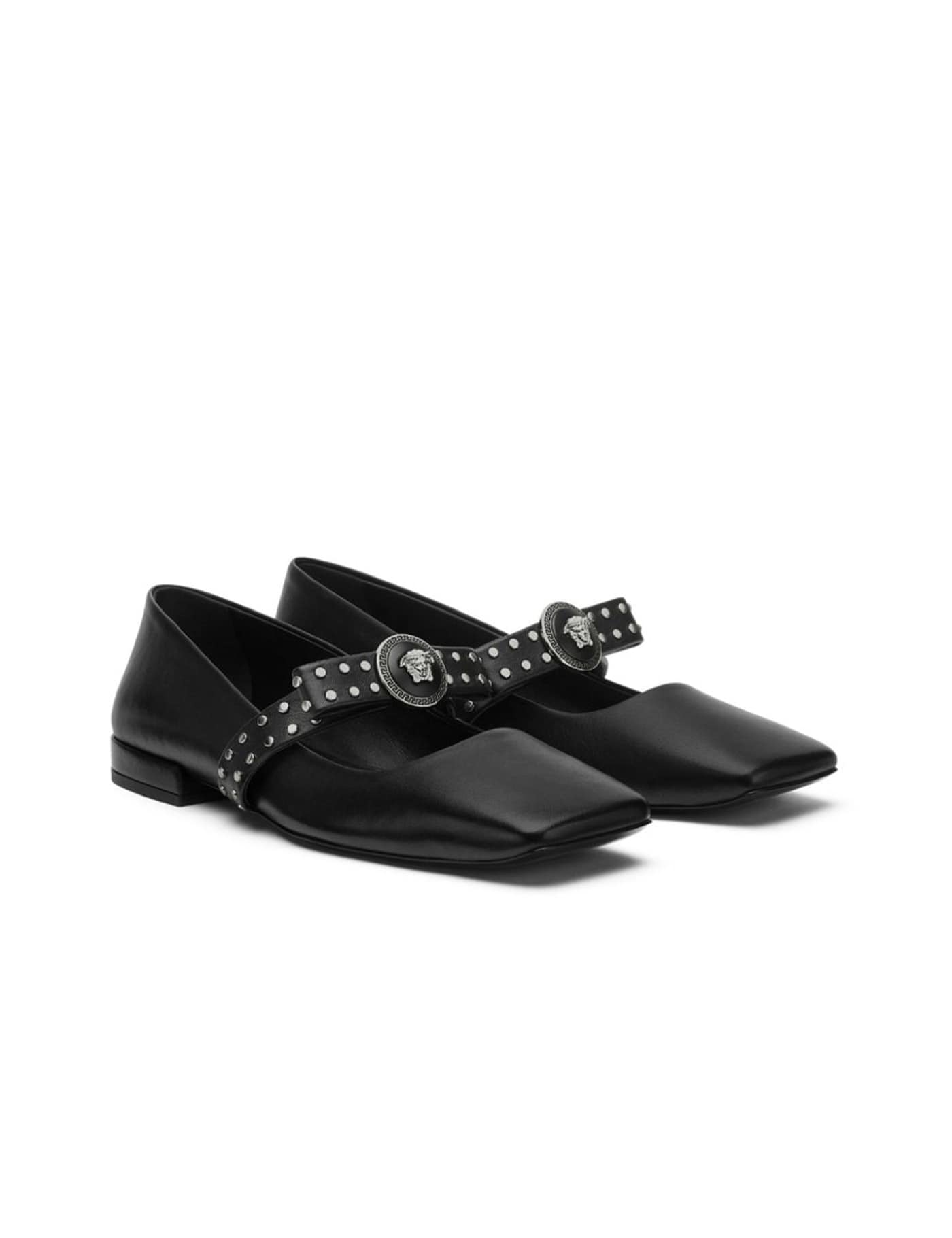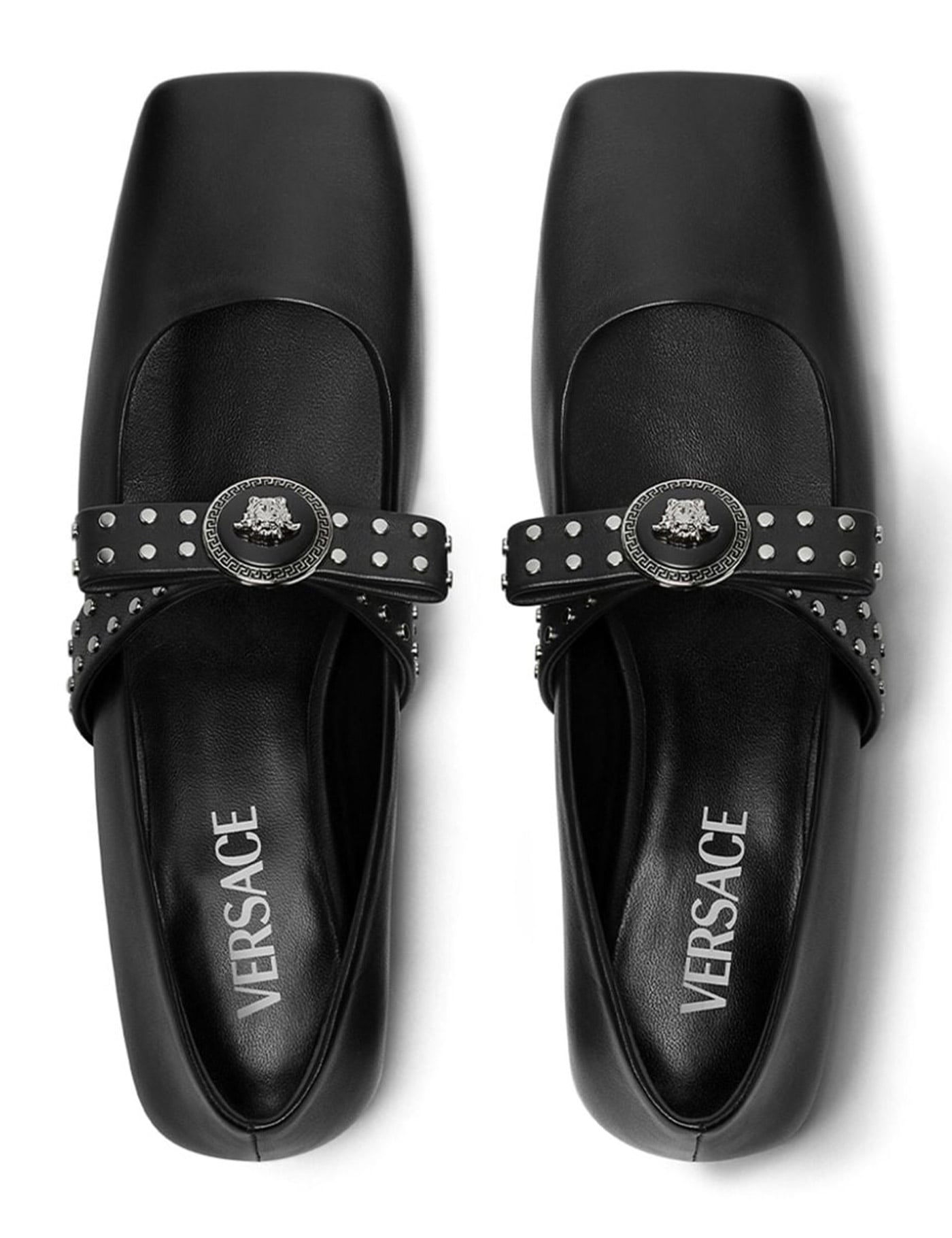 Versace ballerinas made of nappa leather with a square toe and featuring the iconic Medusa detail enamelled on the "Gianni ribbon" bow, all adorned with micro studs. Leather interior and leather sole.